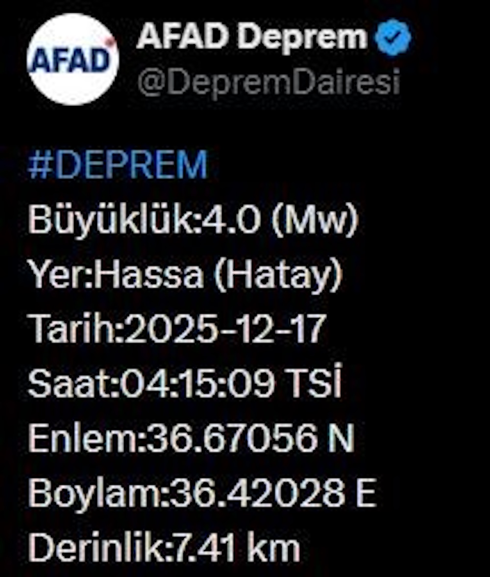 Afet ve Acil Durum Yönetimi Başkanlığı (AFAD), Hatay’da gece saatlerinde meydana gelen bir depremle ilgili kamuoyunu bilgilendirdi. AFAD tarafından paylaşılan verilere göre, Hatay’ın Hassa ilçesinde saat 04.15’te 4.0 büyüklüğünde bir deprem kaydedildi. Sarsıntının yerin 7.41 kilometre derinliğinde meydana geldiği bildirildi.