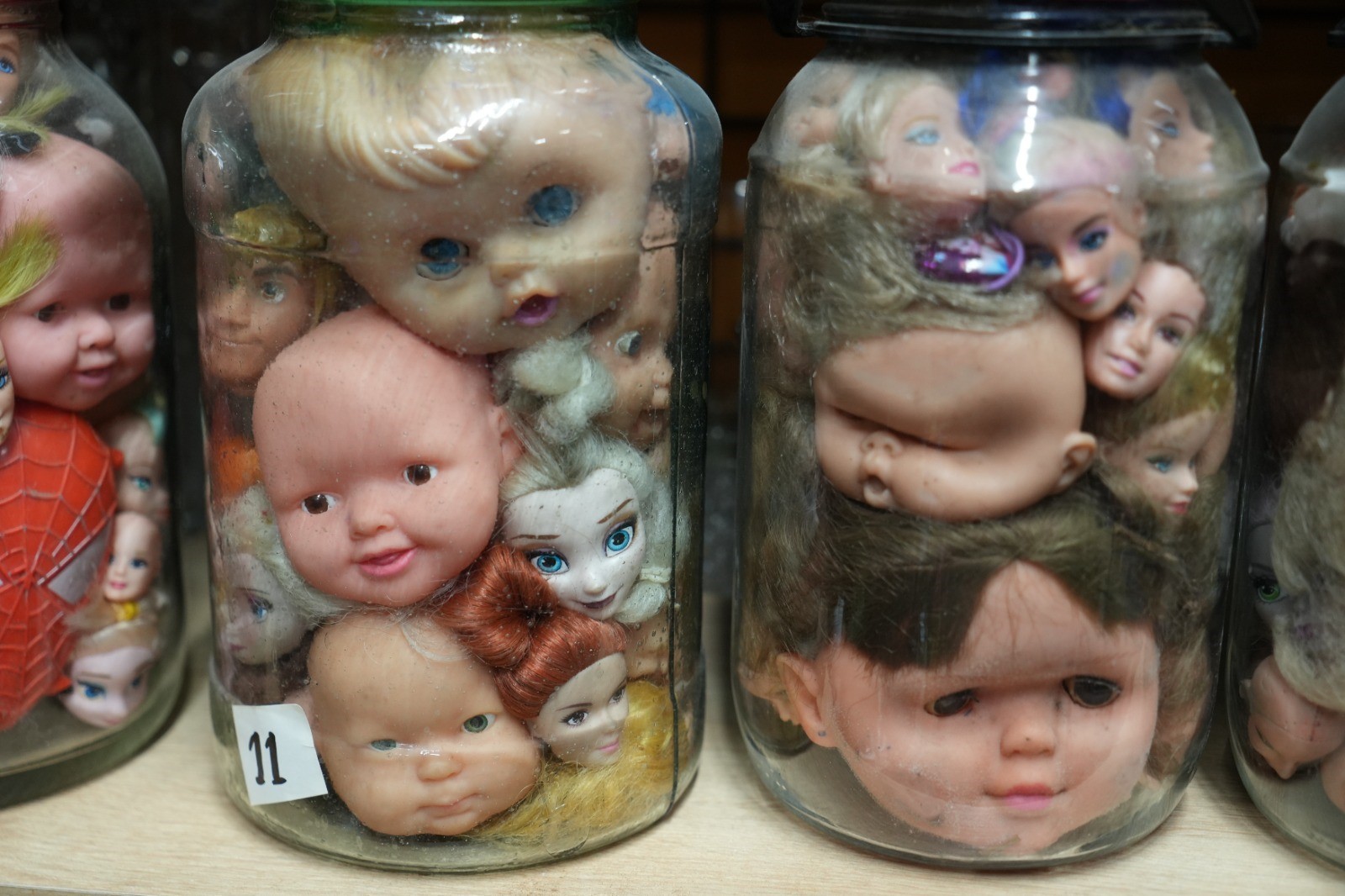 Başta oyuncakların gövdeleriyle saklandığını ancak yer kaplaması nedeniyle zamanla yalnızca kafaların biriktirildiğini söyleyen Dinibütünoğlu, eski ve yeni modellerin bir arada bulunduğunu belirterek, 1940’lardan 2000’lere uzanan geniş bir zaman dilimine ait oyuncakların koleksiyonda yer aldığını ifade etti. Her biri kavanozlarda sıkıştırılarak, orijinal formu korunmuş halde sergilenen kafalar, büyük akvaryumlarda da sergilenmeye devam ediyor.