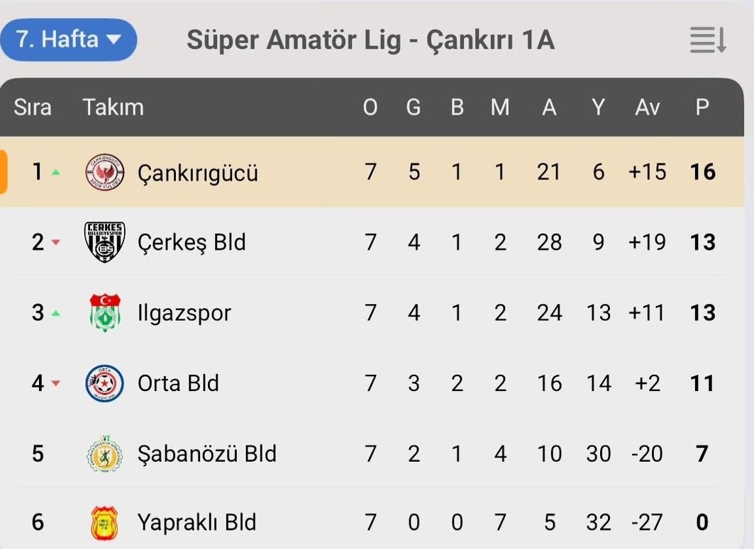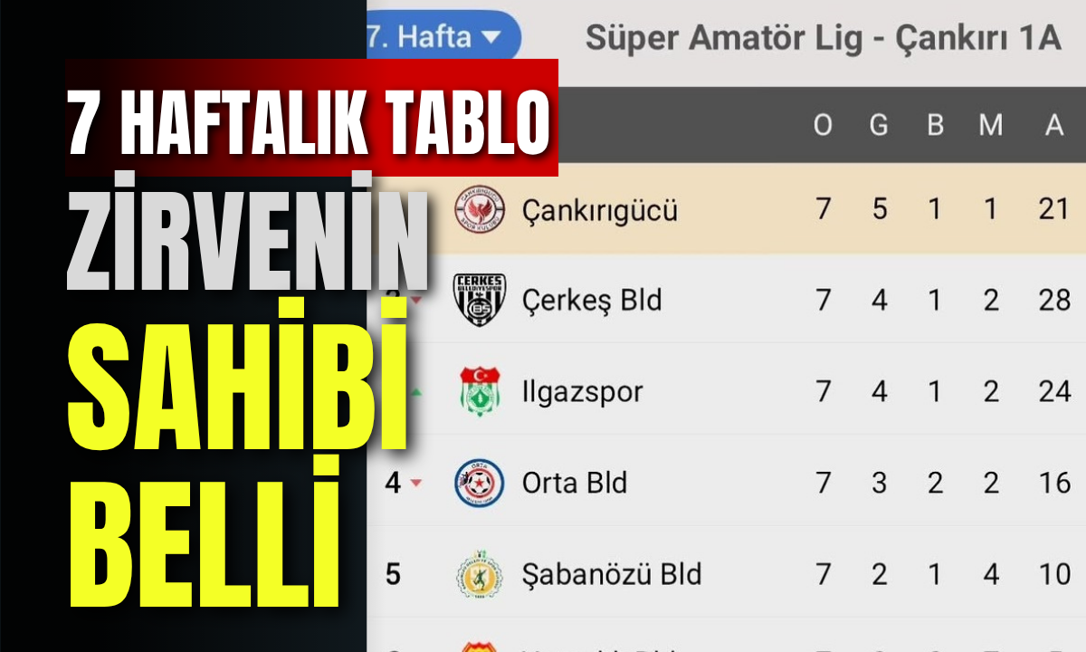 Ligin ikinci sırasında yer alan Çerkeş Belediyespor ise 13 puanla takibini sürdürürken, aynı puana sahip Ilgazspor averajla üçüncü sırada bulunuyor. Üst sıralarda yer alan takımlar arasındaki puan farkının sınırlı olması, önümüzdeki haftalarda rekabetin daha da artacağını gösteriyor.
