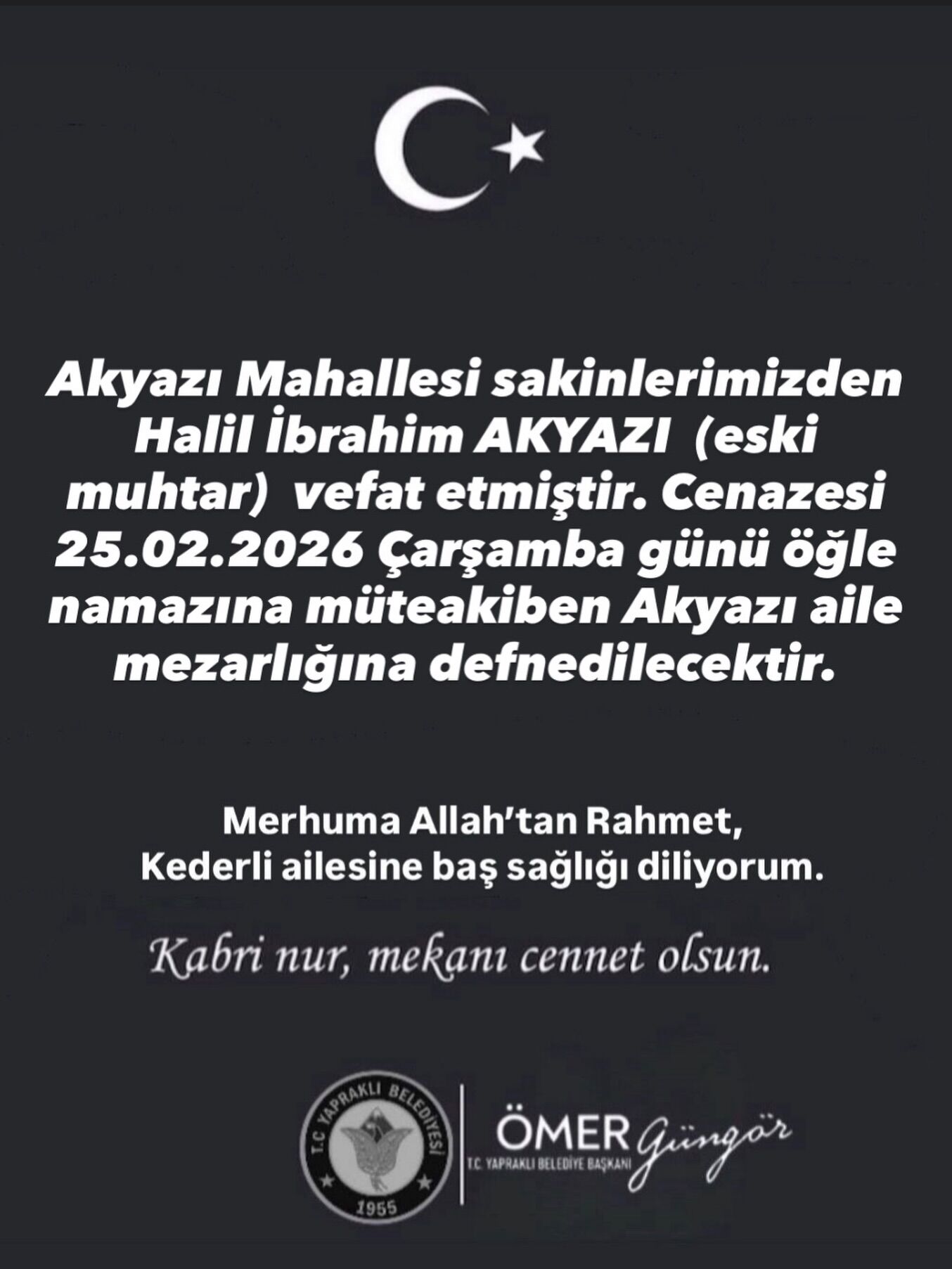 Yapraklı Belediye Başkanı Ömer Güngör de yayımladığı taziye mesajında, merhuma Allah’tan rahmet, kederli ailesine başsağlığı diledi.