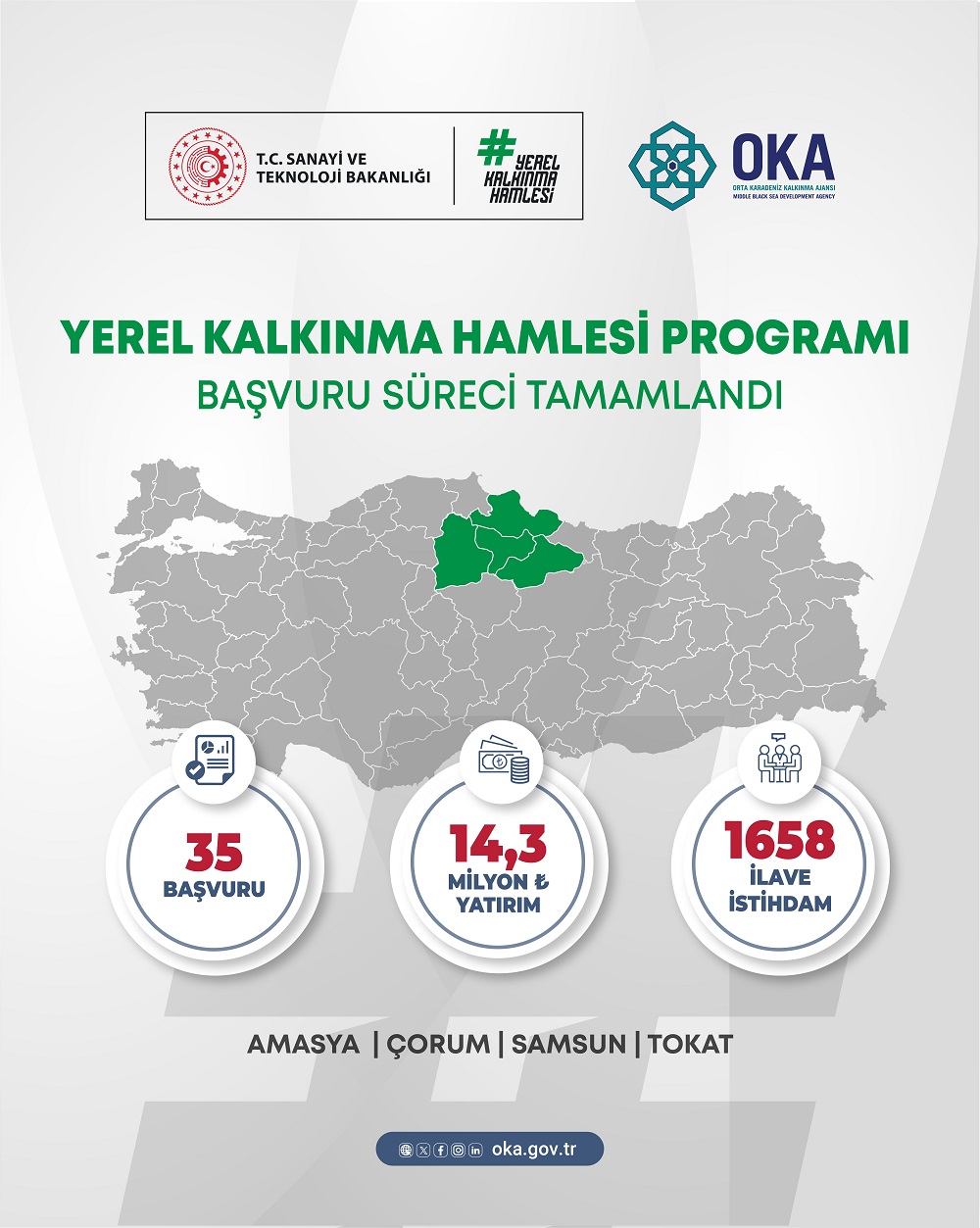 Sanayi ve Teknoloji Bakanlığı’nın koordinasyonunda yürütülen Yerel Kalkınma Hamlesi Teşvik Programı başvuru süreci tamamlandı. Orta Karadeniz Bölgesi’ni kapsayan Amasya, Çorum, Samsun ve Tokat illerinde, Orta Karadeniz Kalkınma Ajansı (OKA) tarafından yürütülen süreçte toplam 35 yatırımcı firma programa başvuruda bulundu. Bu başvurularla birlikte 14,3 milyar TL’lik yatırım hacmi ve 1.658 kişilik yeni istihdam hedefi ortaya çıktı.