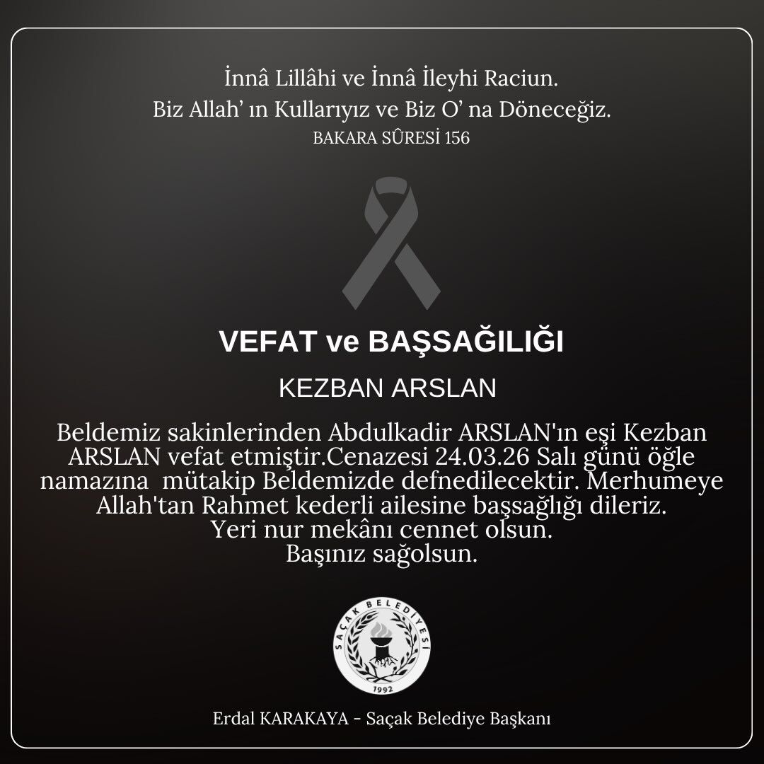 Edinilen bilgilere göre, merhume Kezban Arslan’ın cenazesi 24 Mart 2026 Salı günü öğle namazına müteakip Saçak Beldesi’nde defnedilecek. Arslan’ın vefatı, yakınları ve sevenleri tarafından büyük bir üzüntüyle karşılandı.