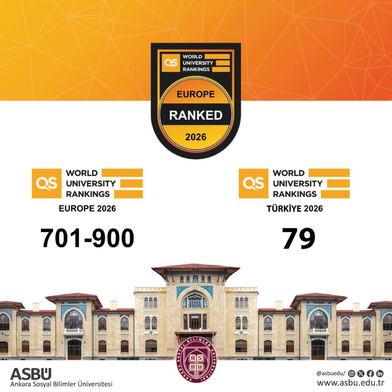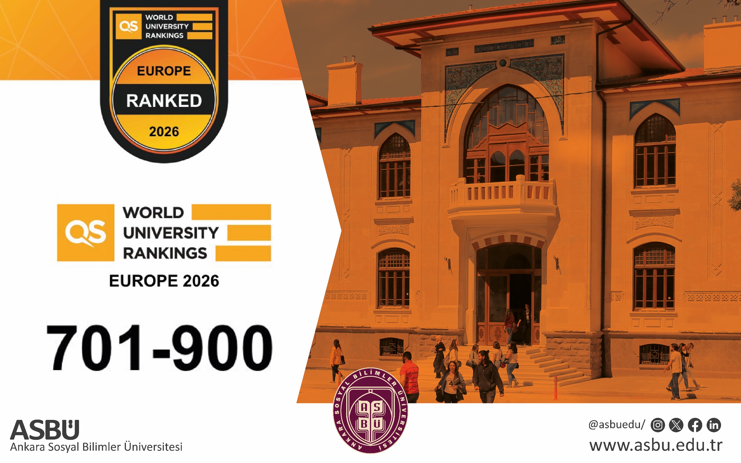 Dünyanın saygın yükseköğretim derecelendirme kuruluşlarından QS (Quacquarelli Symonds) tarafından açıklanan 2026 Avrupa Üniversiteleri Sıralaması sonuçları, Ankara Sosyal Bilimler Üniversitesi’nin (ASBÜ) uluslararası alandaki yükselişini ortaya koydu. Sosyal bilimler alanında tematik yapısıyla öne çıkan üniversite, kısa sürede elde ettiği başarıyla hem Avrupa hem de Türkiye ölçeğinde dikkat çekici bir konuma ulaştı.
