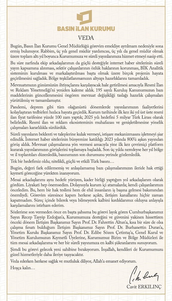 Basın İlan Kurumu Genel Müdürü Cavit Erkılınç, görevinden emekliye ayrıldığını duyurdu. Görev süresince önemli çalışmalara imza atan Erkılınç, yayımladığı veda mesajında “Türk basınına hizmet etmek benim için büyük bir gurur ve onurdu” ifadelerini kullandı.