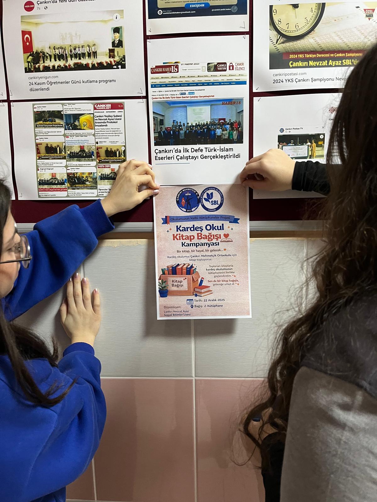 Proje çerçevesinde Nevzat Ayaz Sosyal Bilimler Lisesi ile kardeş okul olarak belirlenen Çankırı Mehmetçik Ortaokulu arasında kitap bağışı iş birliği gerçekleştirildi. Okul yönetiminin koordinasyonunda düzenlenen bağış kampanyasına öğrenciler, öğretmenler, veliler ve okul personeli yoğun ilgi gösterdi. Kampanya süresince, Mehmetçik Ortaokulu öğrencilerinin faydalanabileceği çok sayıda kitap toplandı.