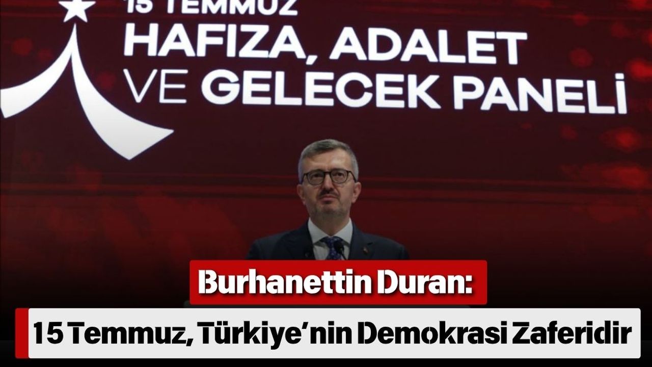 Cumhurbaşkanlığı İletişim Başkanı Burhanettin Duran, "15 Temmuz: Hafıza, Adalet ve Gelecek Paneli"nde önemli mesajlar verdi. 15 Temmuz’un Türk milletinin demokrasiye olan bağlılığının ve istiklal sevincinin altın harflerle yazıldığı kutlu bir zafer olduğunu söyleyen Duran, o gece milletin iradesine zincir vurulamayacağını bir kez daha tüm dünyaya gösterdiğini belirtti. Milletin geceler boyu tuttuğu demokrasi nöbetlerinin dünya demokrasi tarihinde eşi benzeri az görülen bir kararlılık olduğunu vurguladı.
