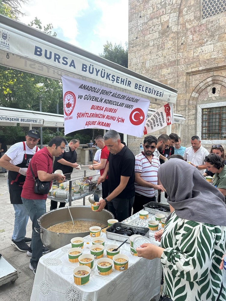 Anadolu Şehit Aileleri Gazileri ve Güvenlik Korucuları Vakfı (AŞAV) Bursa Şubesi, şehitlerin hatırasına anlamlı bir etkinlik düzenledi. Bursa Ulu Cami avlusunda gerçekleştirilen aşure ikramı, binlerce vatandaşa ulaştı. Etkinlik, Bursalılardan büyük ilgi gördü.