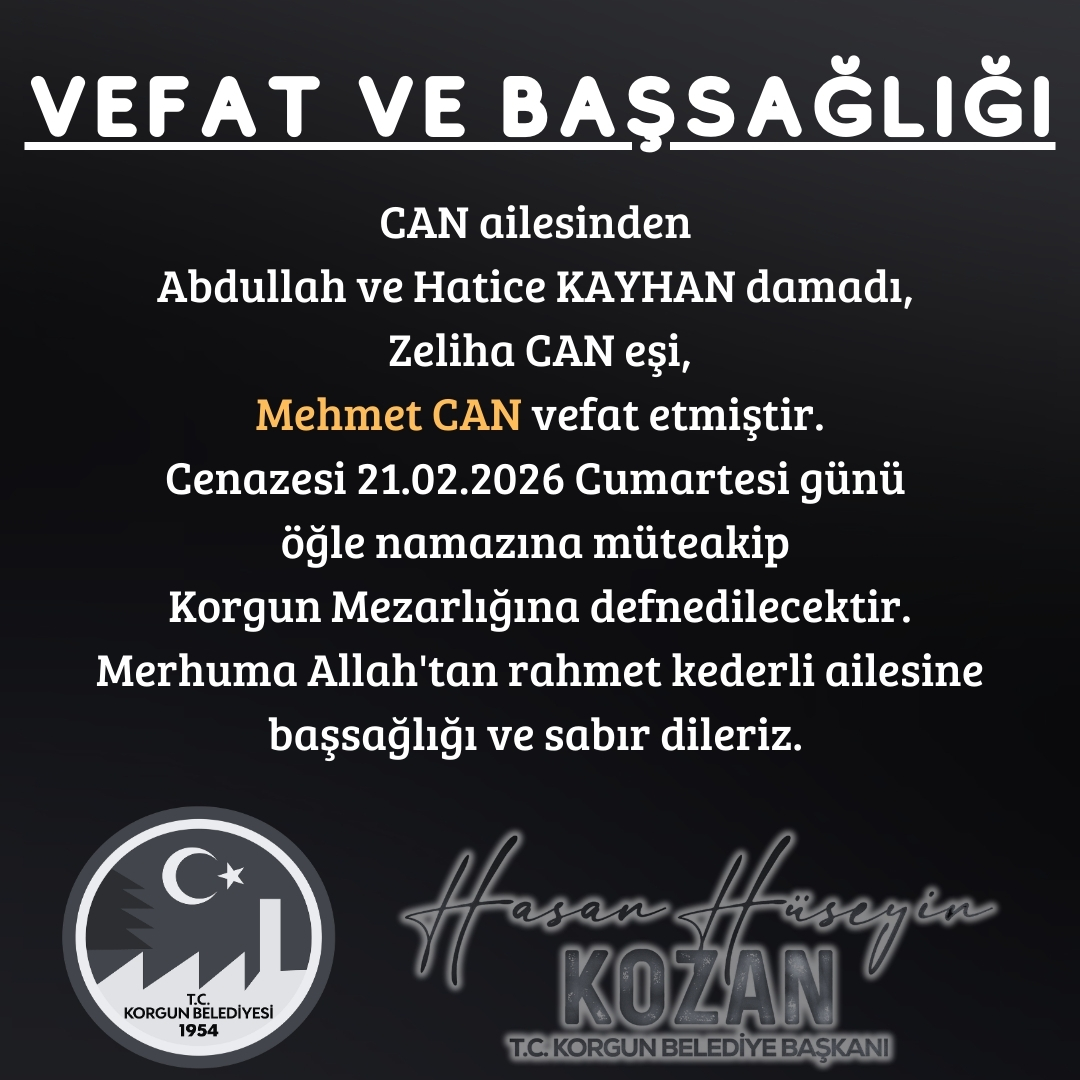 Korgun Belediye Başkanı Hasan Hüseyin Kozan tarafından paylaşılan başsağlığı mesajında, merhum Mehmet Can’ın Abdullah ve Hatice Kayhan’ın damadı, Zeliha Can’ın eşi olduğu belirtildi.