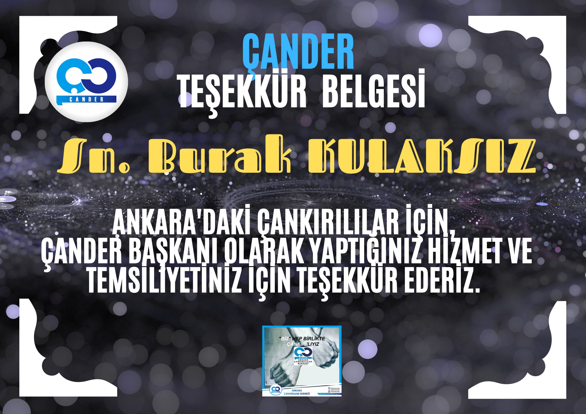 “ÇANDER olarak her daim kendimizi yenilemek, zamanı geldiğinde bayrağı bir sonraki yârene devretmek geleneğimizi sürdürüyoruz. Bu doğrultuda, mevcut Başkanımız Burak Kulaksız, işlerinin yoğunluğu ve kan değişiminin zamanı geldiği düşüncesiyle bayrağı, teşkilat çalışmalarında üstün başarılar gösteren, gönül insanı, vefakâr ve cefakâr Yönetim Kurulu Üyemiz Satılmış Kovancı’ya devretmiştir.”