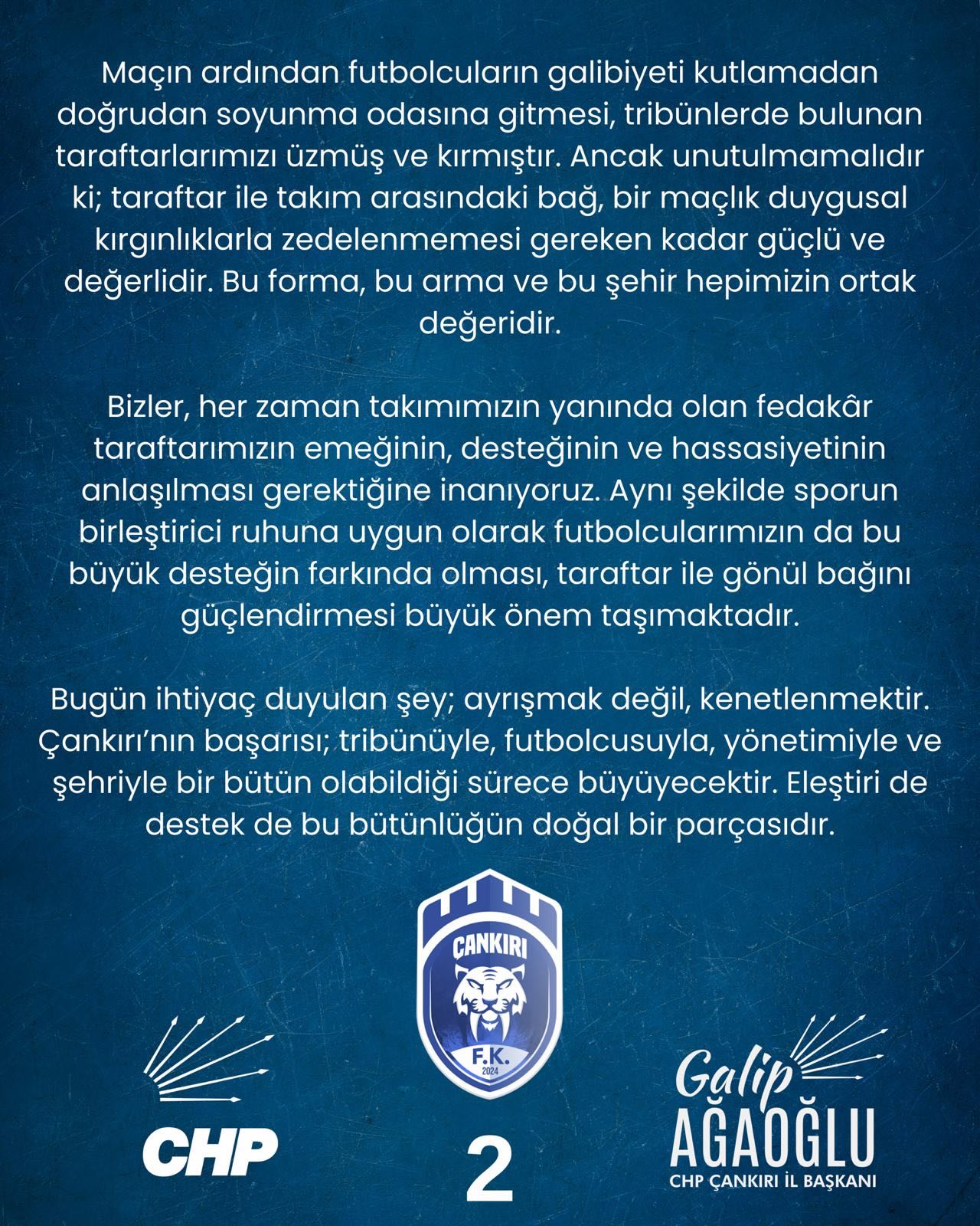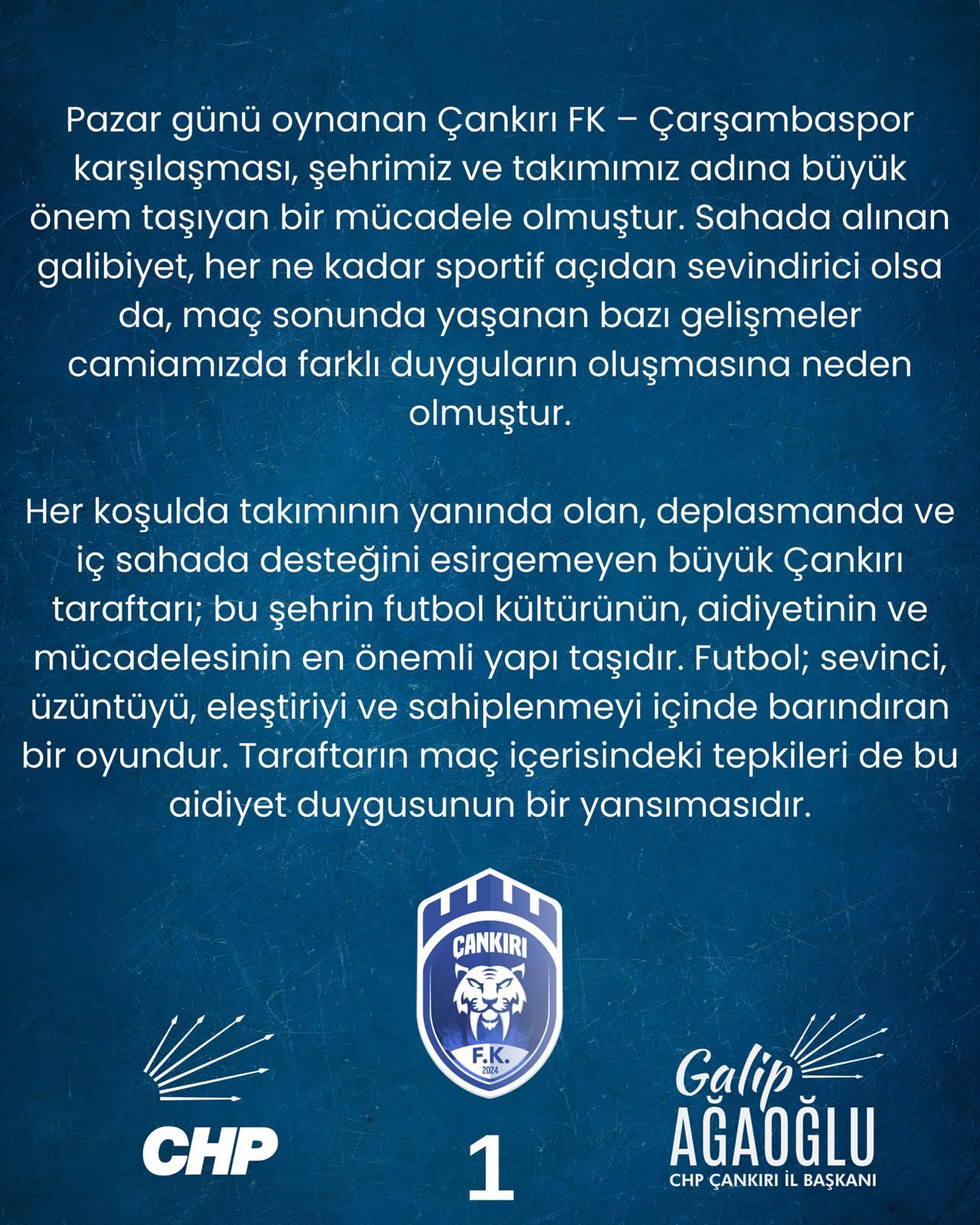 CHP Çankırı İl Başkanı Galip Ağaoğlu imzasıyla yapılan açıklamada, futbolun yalnızca bir spor olmadığı, aynı zamanda aidiyet, birlik ve beraberlik duygularını da barındırdığı vurgulandı. Çankırı taraftarının her koşulda takımının yanında olduğu belirtilen açıklamada, taraftarların maç içerisindeki tepkilerinin de bu bağlılığın bir yansıması olduğu kaydedildi.