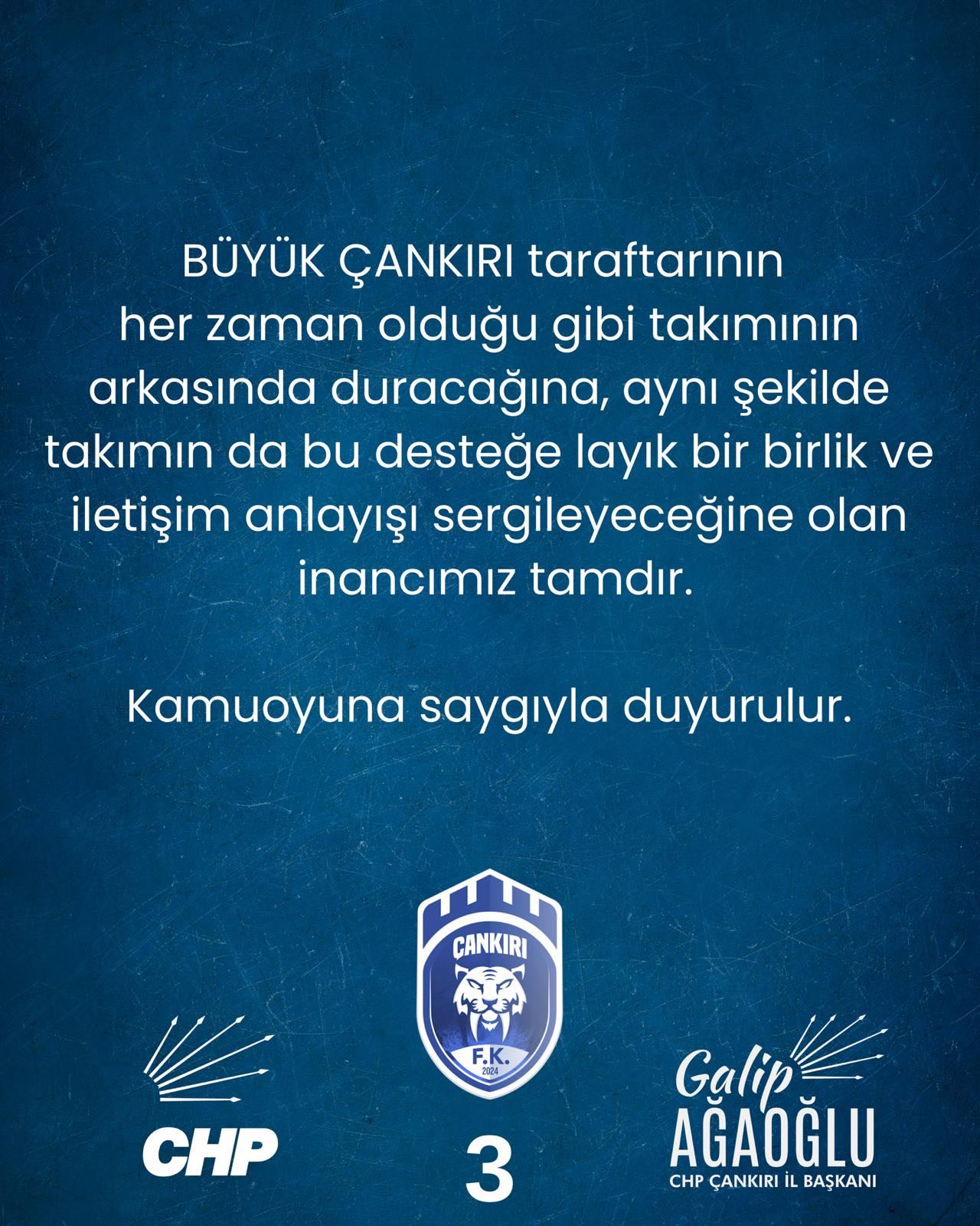 Açıklama, “Büyük Çankırı taraftarının her zaman olduğu gibi takımının arkasında duracağına, takımın da bu desteğe layık bir birlik ve iletişim anlayışı sergileyeceğine olan inancımız tamdır” sözleriyle sona erdi.