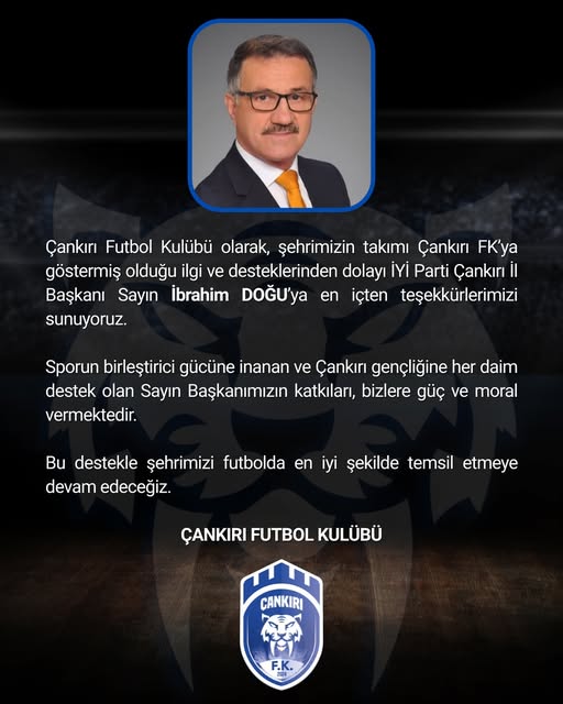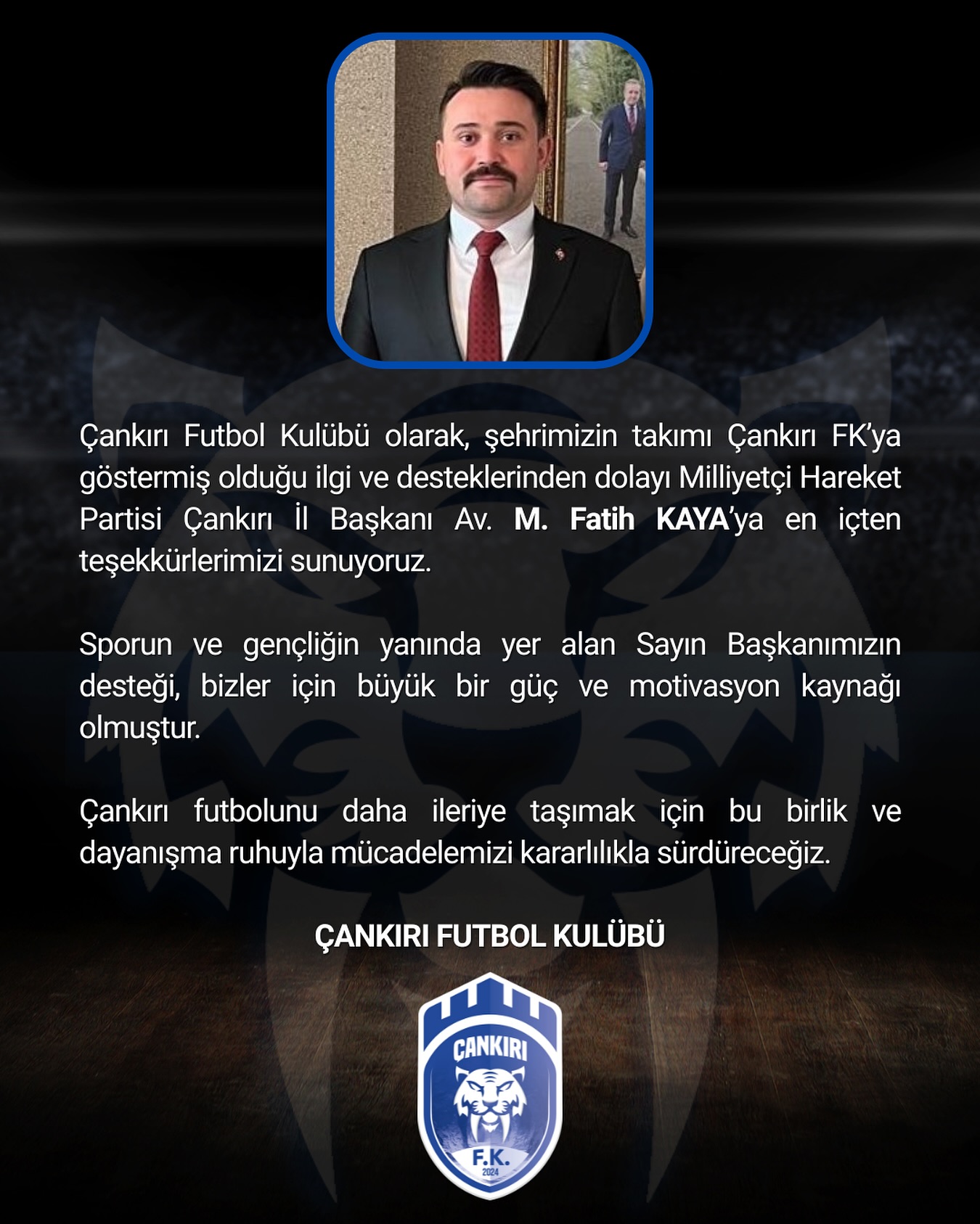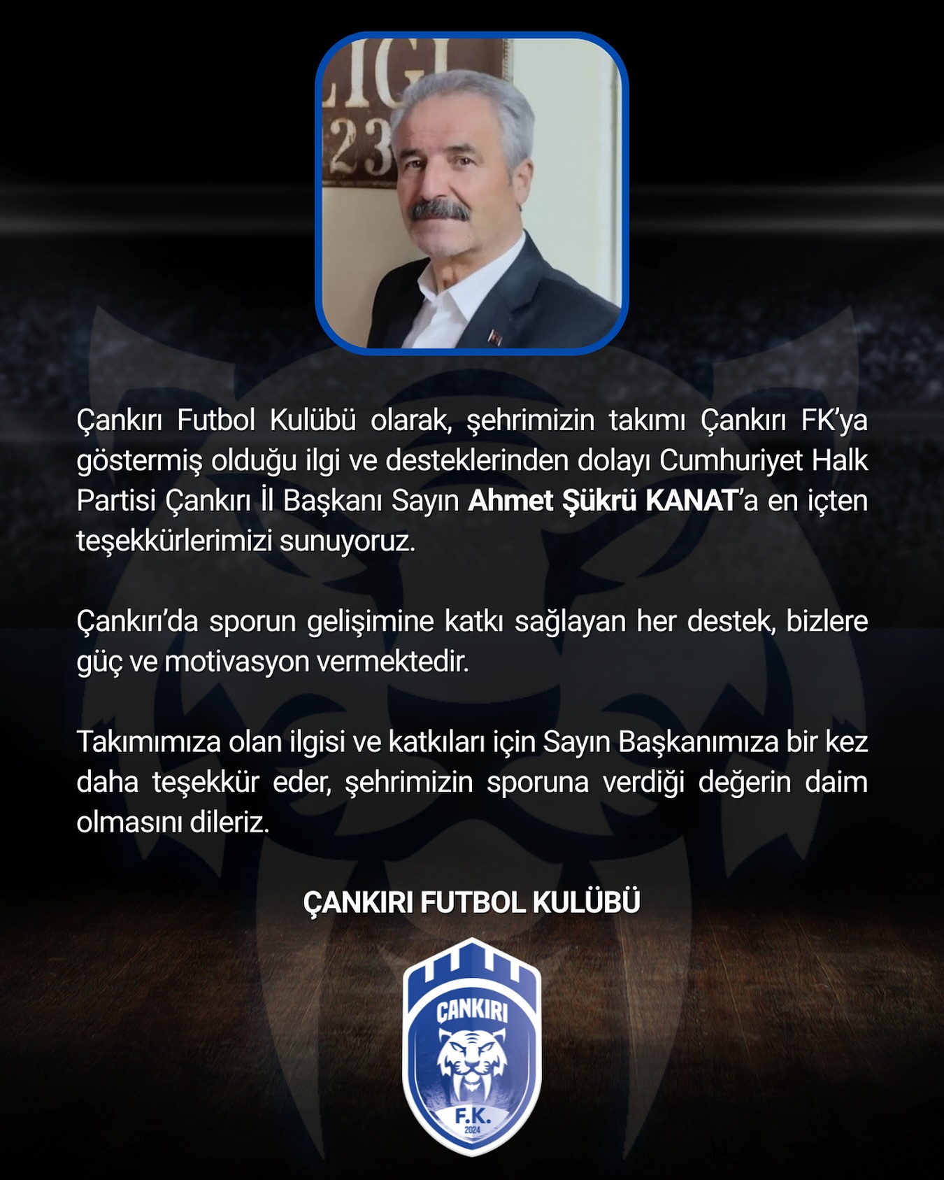 Destek mesajları bununla da sınırlı kalmadı. AK Parti Çankırı İl Başkanı Koray Erdoğan, MHP İl Başkanı Av. M. Fatih Kaya, CHP İl Başkanı Ahmet Şükrü Kanat ve İYİ Parti İl Başkanı İbrahim Doğu da kulübün teşekkür ettiği isimler arasında yer aldı.