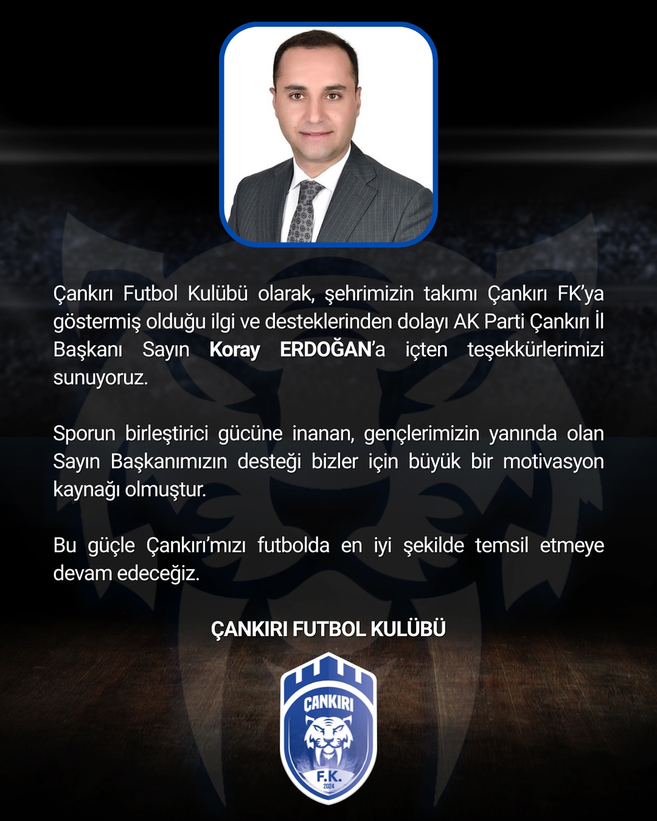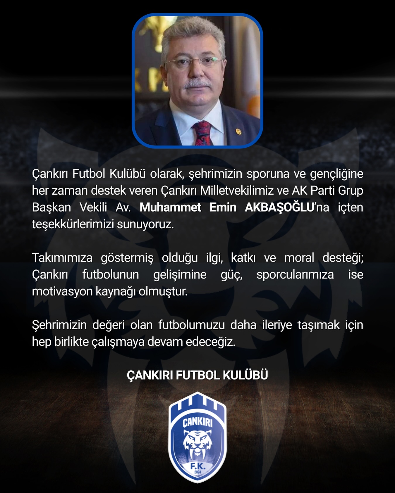 Kulüp tarafından yapılan paylaşımlarda, AK Parti Grup Başkanvekili ve Çankırı Milletvekili Av. Muhammet Emin Akbaşoğlu’na özel bir teşekkür mesajı yer aldı. Mesajda, Akbaşoğlu’nun takıma gösterdiği ilgi, katkı ve moral desteğinin, Çankırı futboluna güç kattığı ve sporcular için önemli bir motivasyon kaynağı olduğu vurgulandı.