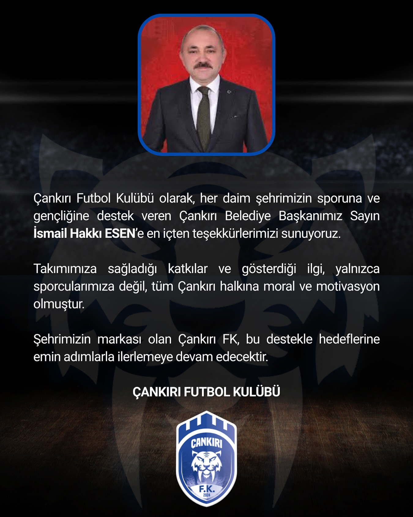 Çankırı Belediye Başkanı İsmail Hakkı Esen için yayımlanan mesajda ise, Başkan Esen’in sporun ve gençliğin yanında yer alan tutumunun hem sporculara hem de Çankırı halkına moral kaynağı olduğu belirtildi. Çankırı FK, “Şehrimizin markası olan kulübümüz, bu destekle hedeflerine emin adımlarla ilerlemeye devam edecektir.” ifadelerini kullandı.