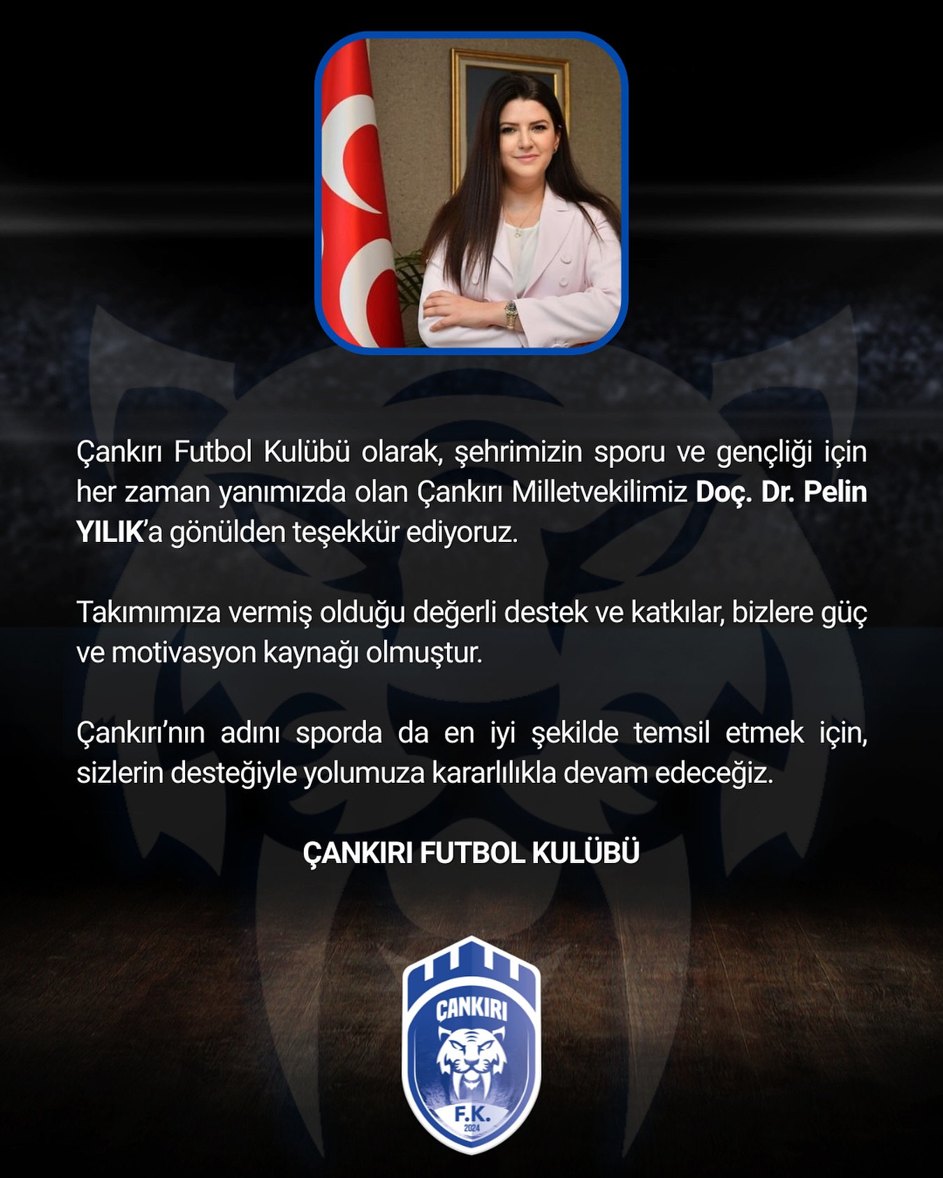 Bir diğer paylaşımda ise Çankırı Milletvekili Doç. Dr. Pelin Yılık’a teşekkür edilerek, spora ve gençliğe verdiği desteğin kulüp için büyük anlam taşıdığı ifade edildi. Kulüp, “Çankırı’nın adını sporda da en iyi şekilde temsil etmek için, sizlerin desteğiyle yolumuza kararlılıkla devam edeceğiz.” sözleriyle Yılık’a olan minnettarlığını dile getirdi.