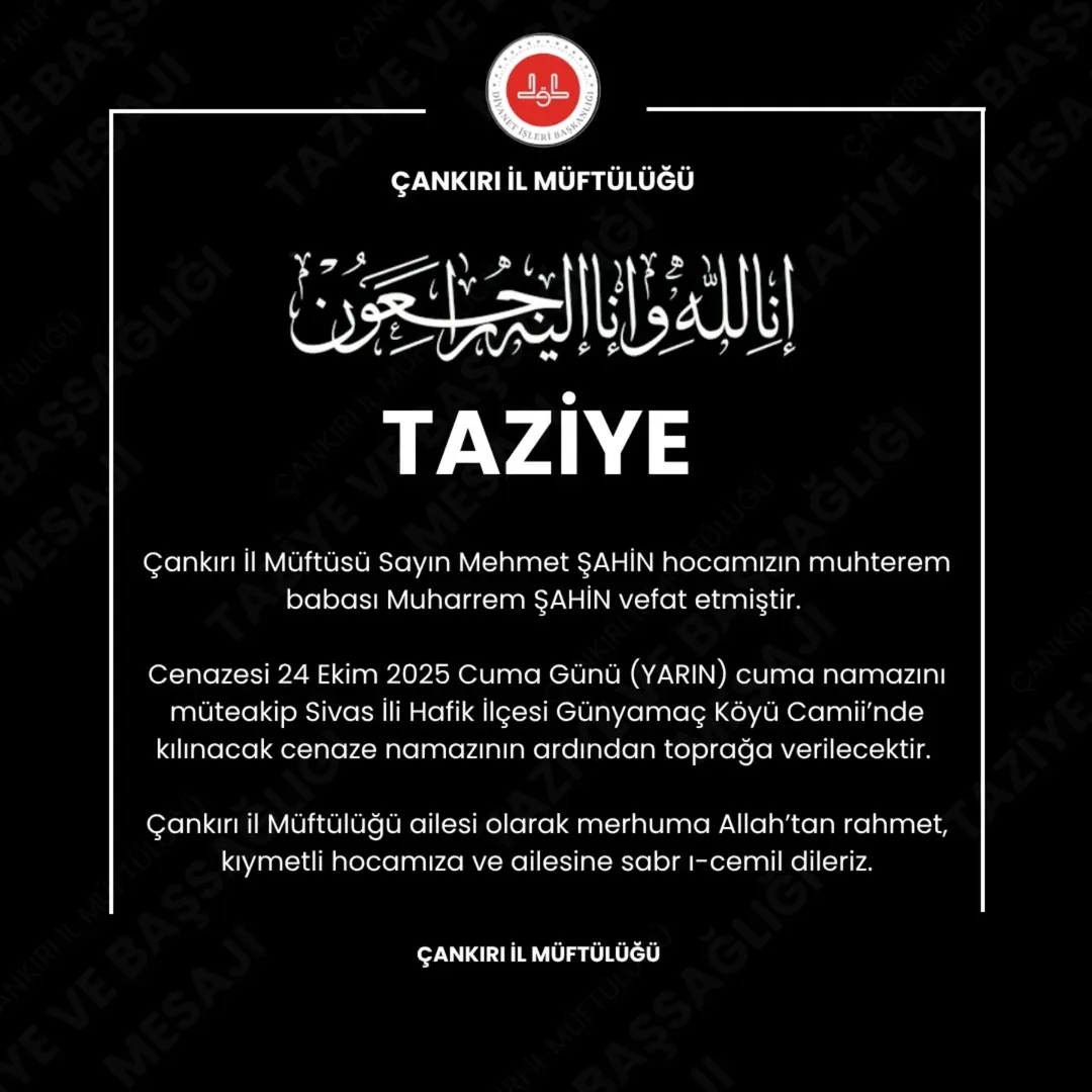 Çankırı İl Müftüsü Mehmet Şahin’in muhterem babası Muharrem Şahin, vefat etti. Merhumun cenazesi, 24 Ekim 2025 Cuma günü, Cuma namazına müteakip memleketi Sivas’ın Akıncılar ilçesine bağlı Günyamaç Köyü Camii’nde kılınacak cenaze namazının ardından köy mezarlığında toprağa verilecek.
