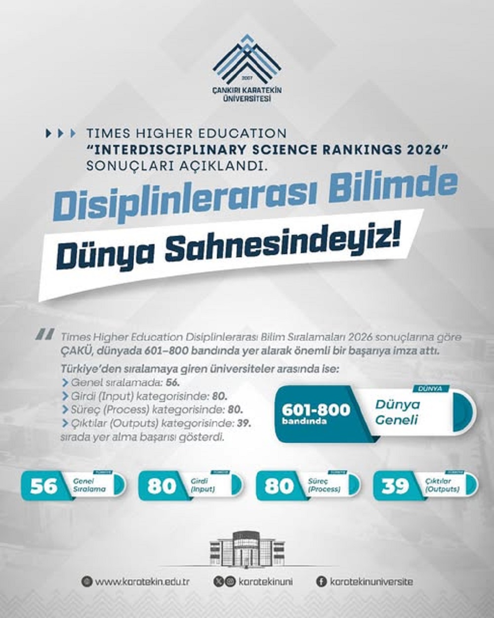 Çankırı Karatekin Üniversitesi, uluslararası akademik platformlarda adından söz ettirmeye devam ediyor. Times Higher Education Disiplinlerarası Bilim Sıralamaları 2026 sonuçlarına göre üniversite, dünyada 601–800 bandında yer alarak önemli bir başarıya imza attı. Bu sonuç, Çankırı Karatekin Üniversitesi’nin disiplinlerarası bilim çalışmalarına verdiği önemin ve araştırma kapasitesinin bir göstergesi olarak değerlendiriliyor.