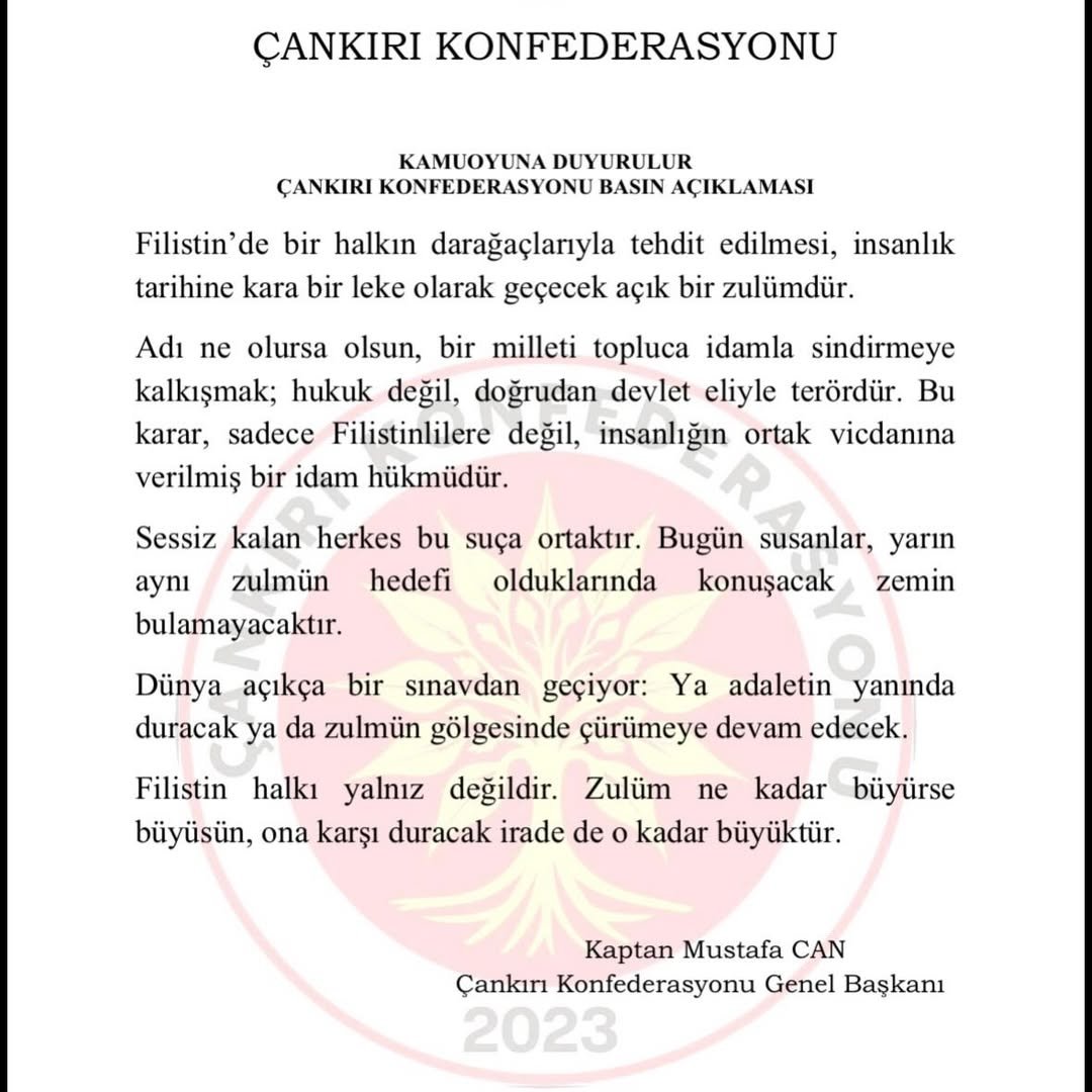 Çankırı Konfederasyonu, Filistin’de yaşanan gelişmelere ilişkin kamuoyuna yönelik bir basın açıklaması yaptı. Konfederasyon tarafından yayımlanan açıklamada, bölgede yaşanan olaylara dair değerlendirmelere yer verilirken, uluslararası kamuoyuna çağrıda bulunuldu.