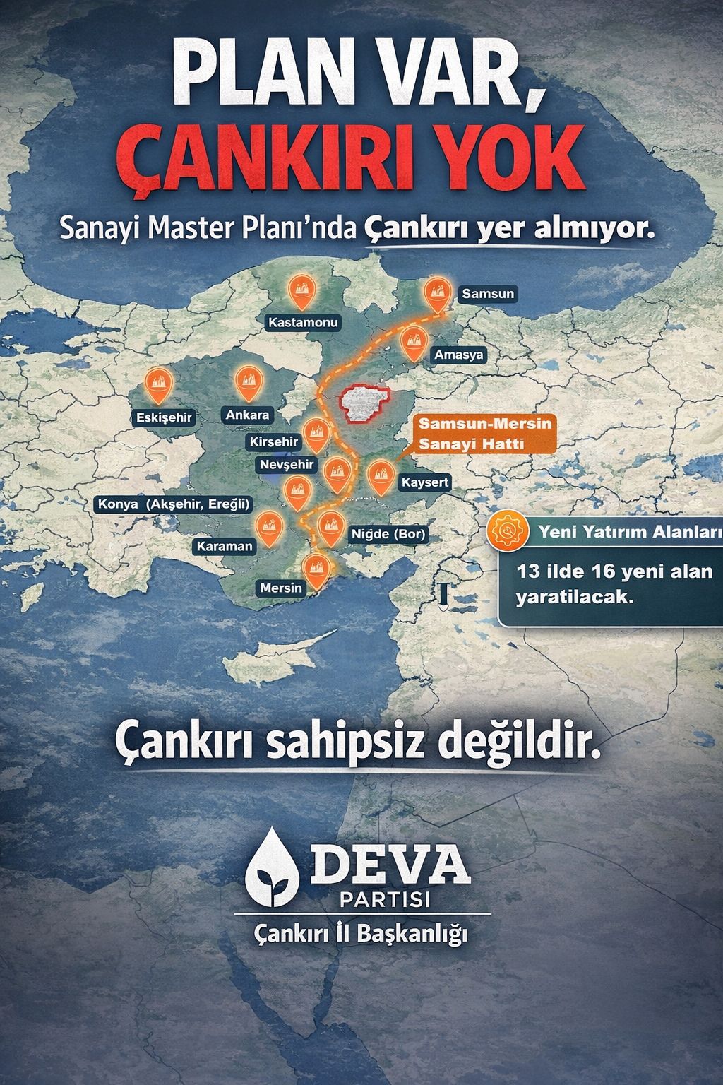 DEVA Partisi Çankırı İl Başkanlığı, Sanayi ve Teknoloji Bakanı tarafından kamuoyuna açıklanan Türkiye Sanayi Master Planı ile ilgili sert ifadeler içeren bir basın açıklaması yayımladı. “Plan var, Çankırı yok!” başlığıyla yapılan açıklamada, çevre illere yönelik çok sayıda yatırım, teşvik ve kalkınma projesinin yer aldığı plana rağmen Çankırı’ya dair herhangi bir başlığın bulunmamasına dikkat çekildi.