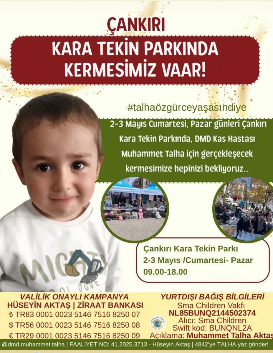 Çankırı’da (DMD) kas hastası Muhammet Talha için destek amacıyla kermes düzenlenecek. Valilik onaylı kampanya kapsamında gerçekleştirilecek etkinlik, 2-3 Mayıs tarihlerinde vatandaşların katılımına açık olacak.