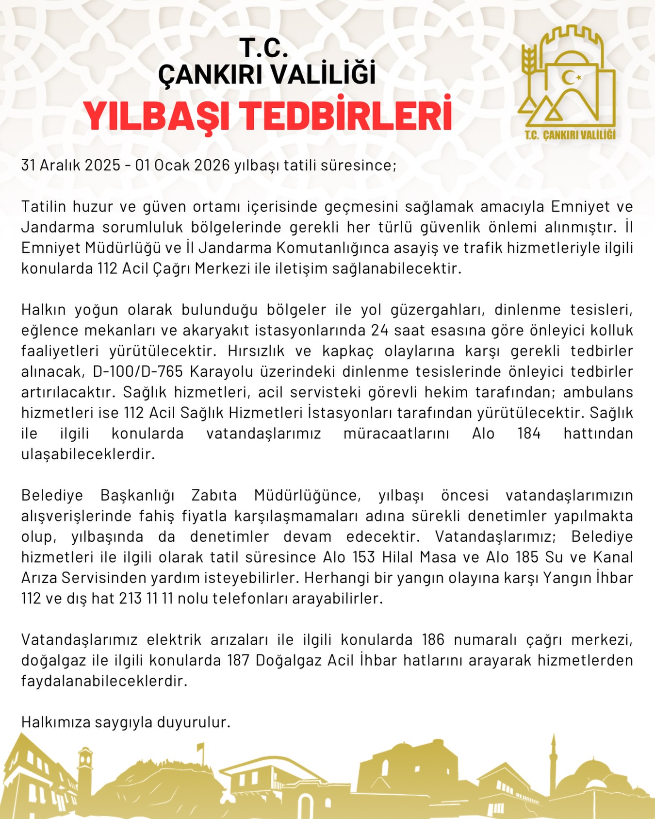 Çankırı Valiliği, yılbaşı tatili süresince vatandaşların güvenli ve huzurlu bir ortamda zaman geçirmesi için kapsamlı önlemler alındığını açıkladı. Valilikten yapılan yazılı açıklamada, 31 Aralık 2025 – 01 Ocak 2026 tarihleri arasında Emniyet ve Jandarma sorumluluk bölgelerinde tüm güvenlik tedbirlerinin uygulanacağı belirtildi.