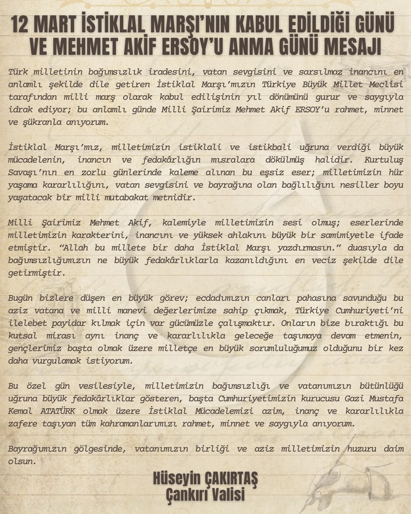 Çankırı Valisi Hüseyin Çakırtaş, 12 Mart İstiklal Marşı’nın kabul edilişinin yıl dönümü ve Mehmet Akif Ersoy’u Anma Günü dolayısıyla bir mesaj yayımladı.