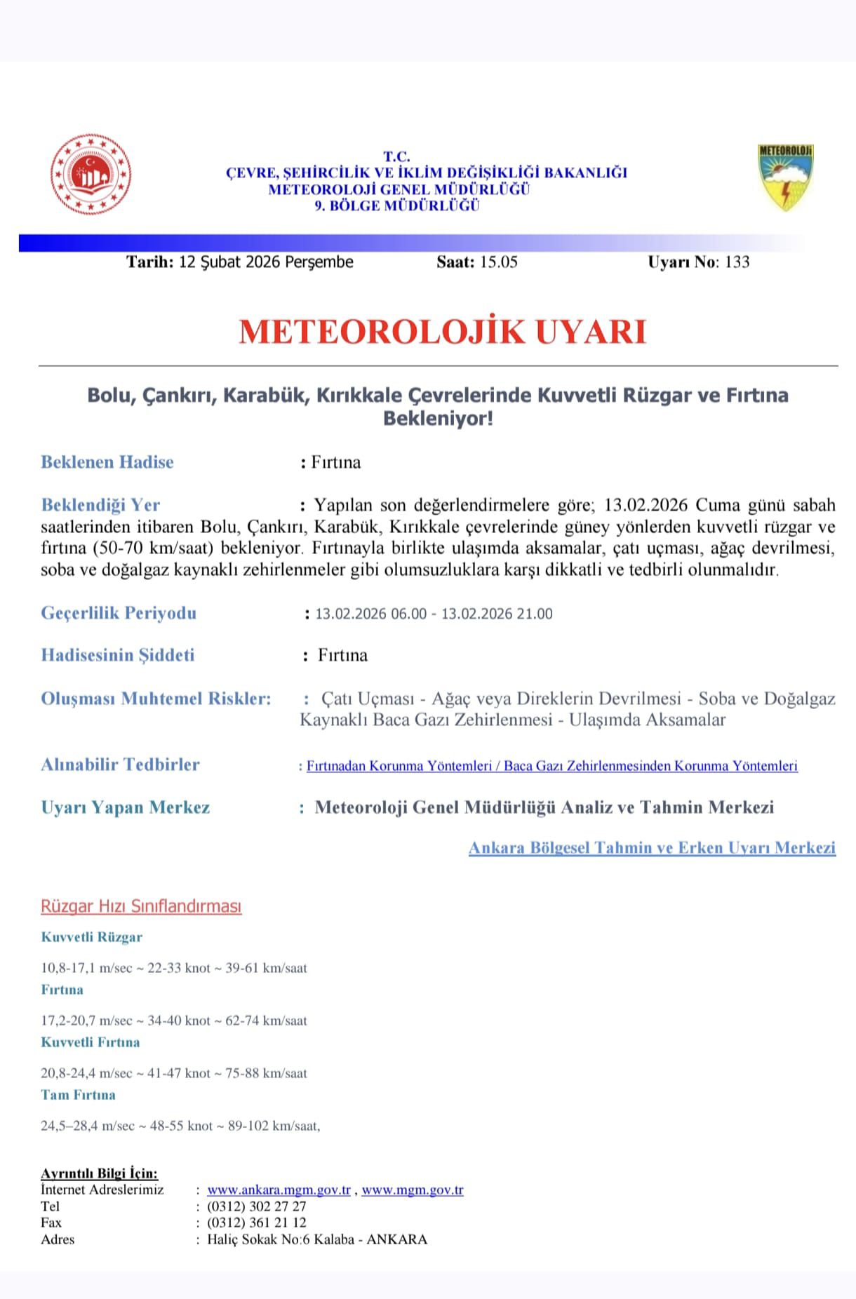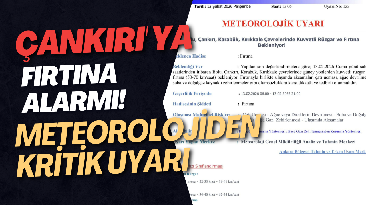 Meteoroloji Genel Müdürlüğü 9. Bölge Müdürlüğü tarafından yayımlanan meteorolojik uyarıya göre, Çankırı’da kuvvetli rüzgar ve fırtına bekleniyor. Yapılan son değerlendirmelere göre, 13 Şubat Cuma günü sabah saatlerinden itibaren Çankırı ve çevresinde güney yönlerden esecek kuvvetli rüzgarın zaman zaman fırtına şeklinde etkili olacağı bildirildi.