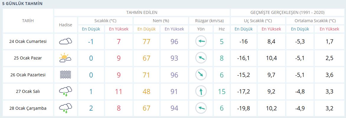 Tahminlere göre 24 Ocak Cumartesi günü en düşük sıcaklık -1 derece, en yüksek sıcaklık ise 7 derece olarak ölçülecek. Nem oranının yüzde 77 ile 96 arasında seyretmesi beklenirken, rüzgârın saatte 5 km hızla etkili olacağı bildirildi.