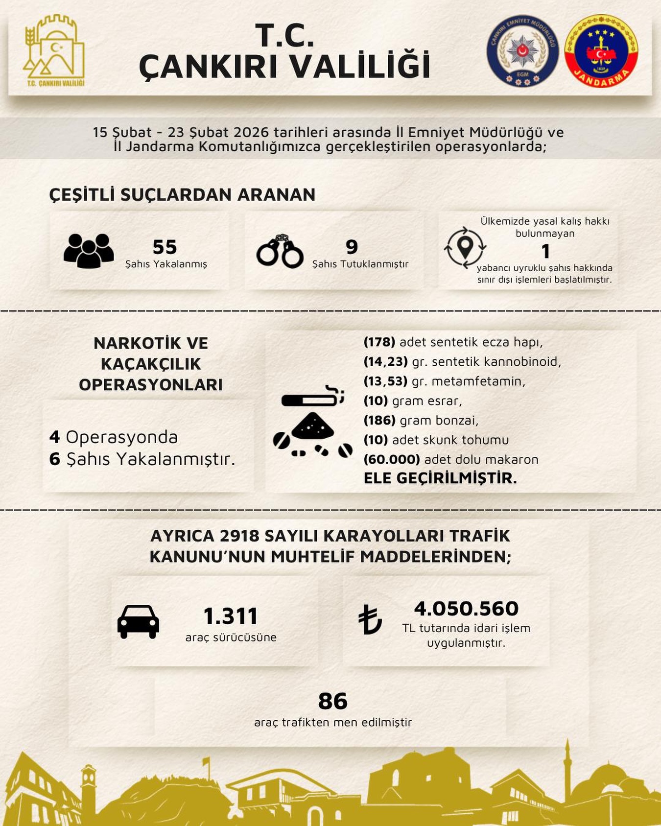Çankırı genelinde 15 Şubat 2026 - 23 Şubat 2026 tarihleri arasında İl Emniyet Müdürlüğü ve İl Jandarma Komutanlığı ekiplerince gerçekleştirilen uygulama ve denetimlerin bilançosu açıklandı. Yapılan kapsamlı çalışmalar kapsamında özellikle trafik denetimleri dikkat çekti.
