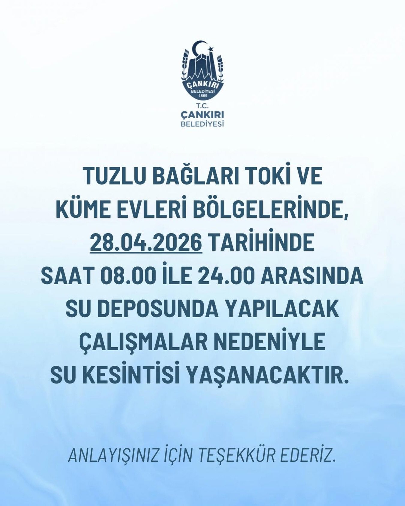 Çankırı Belediyesi tarafından yapılan bilgilendirmede, Tuzlu Bağları TOKİ ve Küme Evleri bölgelerinde 28 Nisan 2026 Salı günü saat 08.00 ile 24.00 arasında su kesintisi yaşanacağı belirtildi.
