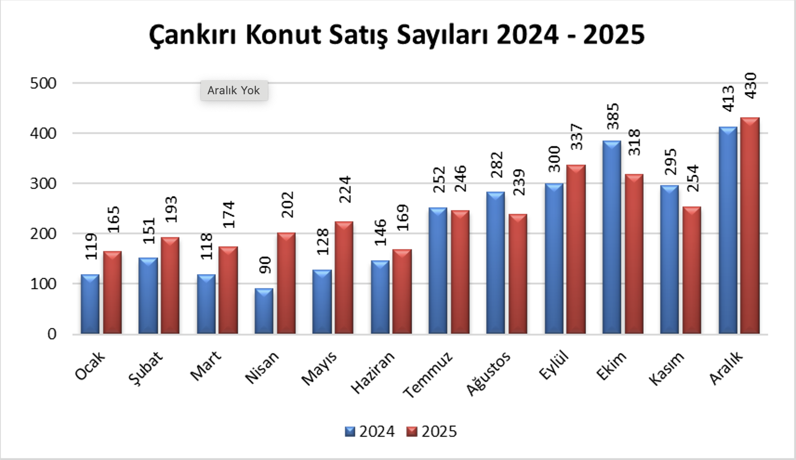 Aralık ayı özelinde değerlendirildiğinde ise Çankırı genelinde 430 konut satışı gerçekleşti. Bu sayı, bir önceki yılın aynı ayına göre 17 adet artış gösterdi. Aralık ayında Çankırı Merkez ilçesinde 260 konut satılırken, merkez ilçenin il genelindeki payı yüzde 60,5 olarak hesaplandı.