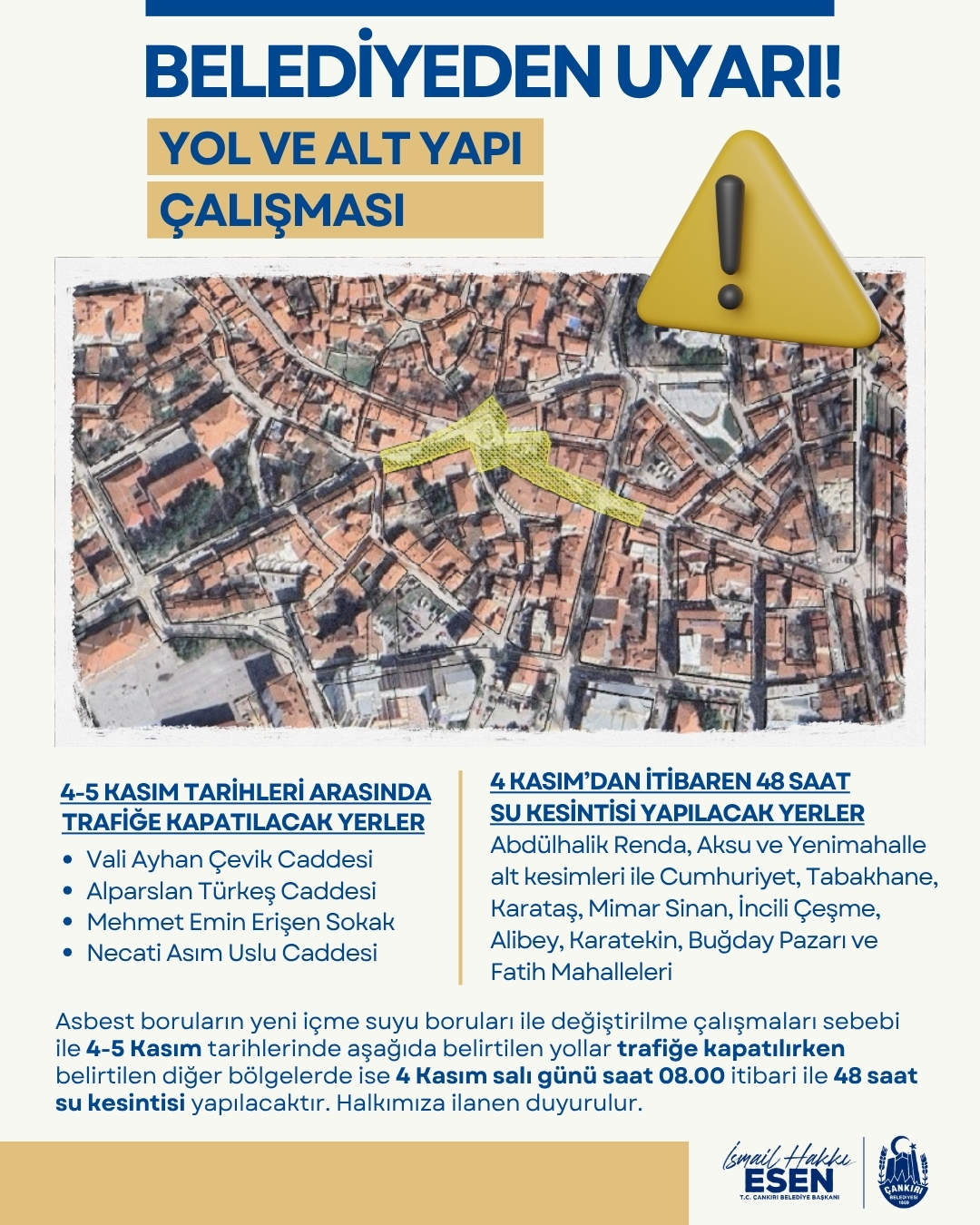 Çankırı Belediyesi, şehir genelinde yürütülen içme suyu altyapı yenileme çalışmaları kapsamında önemli bir duyuru yaptı. 4-5 Kasım tarihleri arasında kentin bazı noktalarında yollar trafiğe kapatılacak olup, 4 Kasım Salı günü saat 08.00’den itibaren belirli mahallelerde 48 saat süreyle su kesintisi uygulanacaktır.