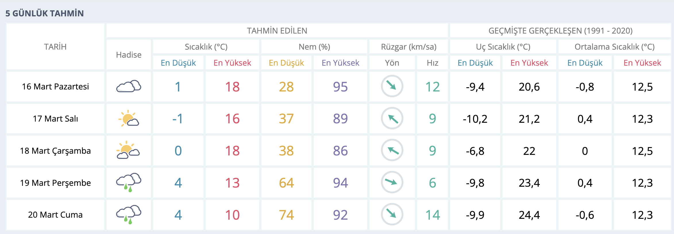 16 Mart Pazartesi günü parçalı bulutlu bir hava beklenirken sıcaklıkların 1 ile 18 derece arasında değişeceği tahmin ediliyor.