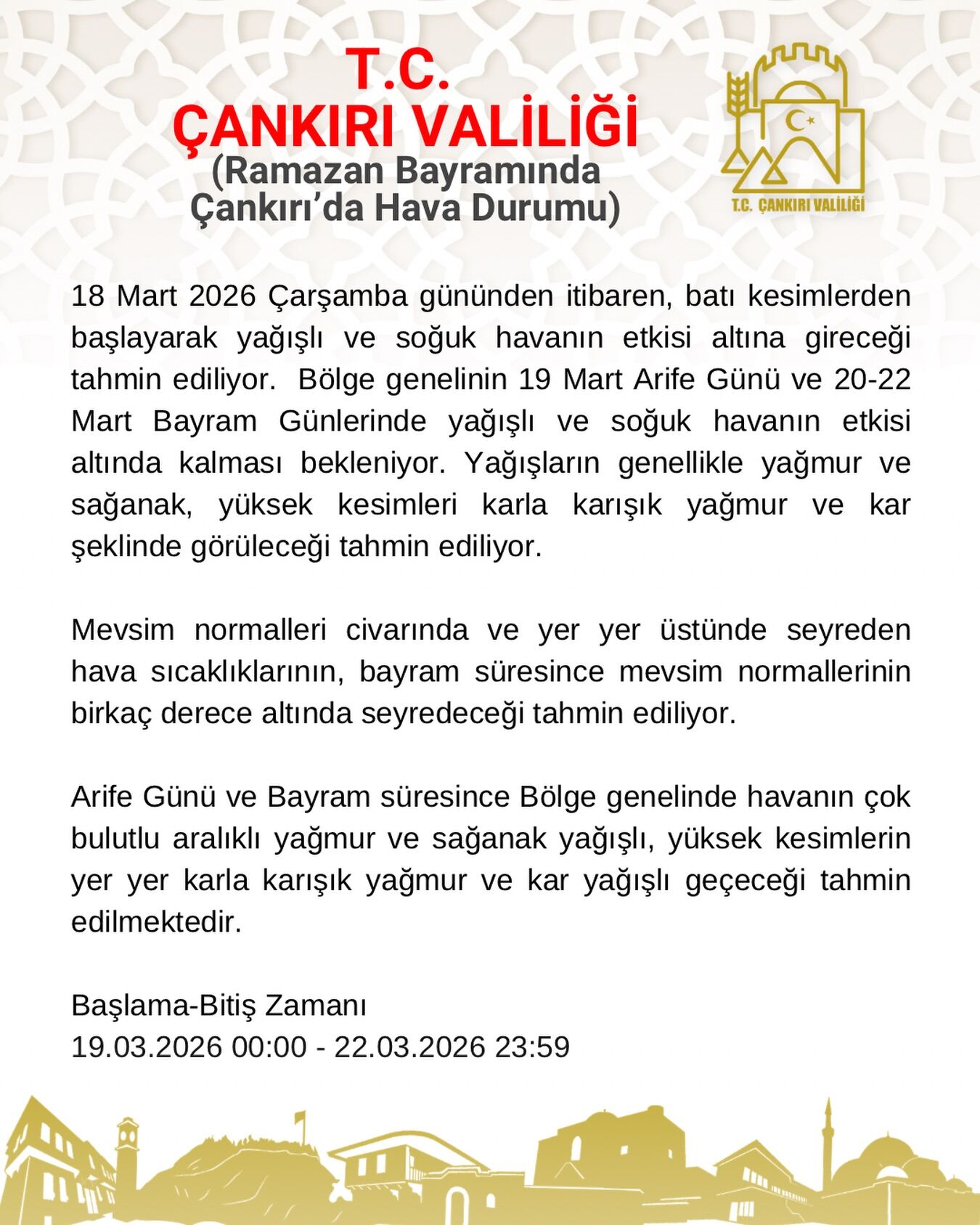 Yapılan açıklamada, belirtilen hava koşullarının 19 Mart 2026 saat 00.00 ile 22 Mart 2026 saat 23.59 arasında etkili olmasının beklendiği ifade edildi. Bayram ziyaretleri ve yolculuk planlayan vatandaşların güncel hava durumunu takip etmeleri önerildi.