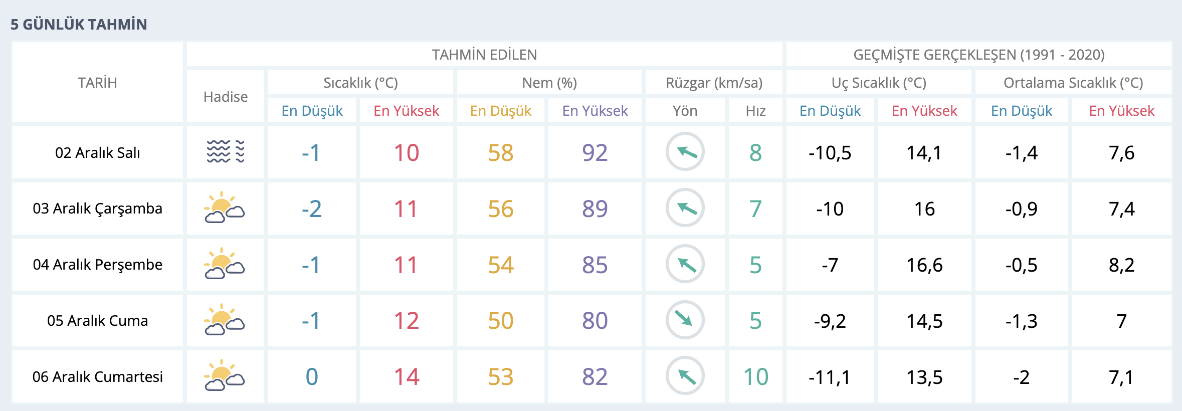 3 Aralık Çarşamba günü hava parçalı bulutlu devam edecek. En düşük sıcaklık -2°C, en yüksek sıcaklık 11°C olacak. Nem oranı yüzde 56–89 arasında seyredecek.