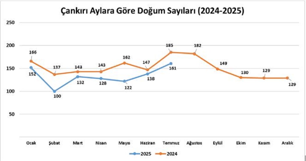 Doğum sayılarındaki bu düşüş, TÜİK’in kamuoyuyla paylaştığı aylık grafikte de açıkça görülüyor. 2024 yılında özellikle Temmuz ve Ağustos aylarında 180’in üzerinde kaydedilen doğum sayıları, 2025 yılı aynı döneminde belirgin şekilde daha düşük seyretti. Ocak ayında 152 olarak başlayan 2025 yılı doğum sayıları, Şubat'ta 100’e kadar geriledi. Yıl genelinde 120–160 bandında dalgalanan grafik, geçen yıla kıyasla istikrarlı bir düşüş eğilimine işaret ediyor.