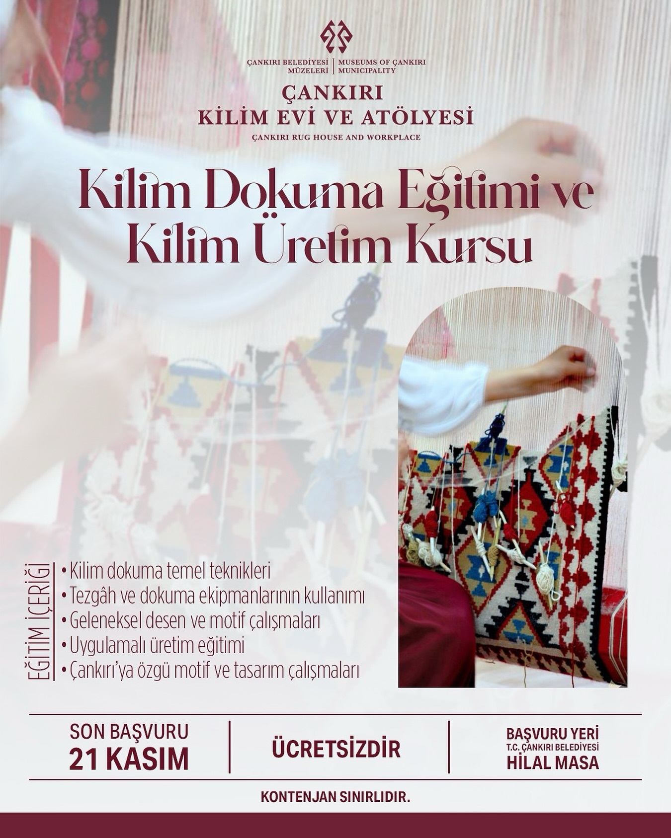 Eğitim kapsamında, kilim dokuma temel teknikleri, tezgâh ve dokuma ekipmanlarının kullanımı, geleneksel desen ve motif çalışmaları, uygulamalı üretim eğitimi ile Çankırı’ya özgü motif ve tasarım uygulamaları yer alacak.