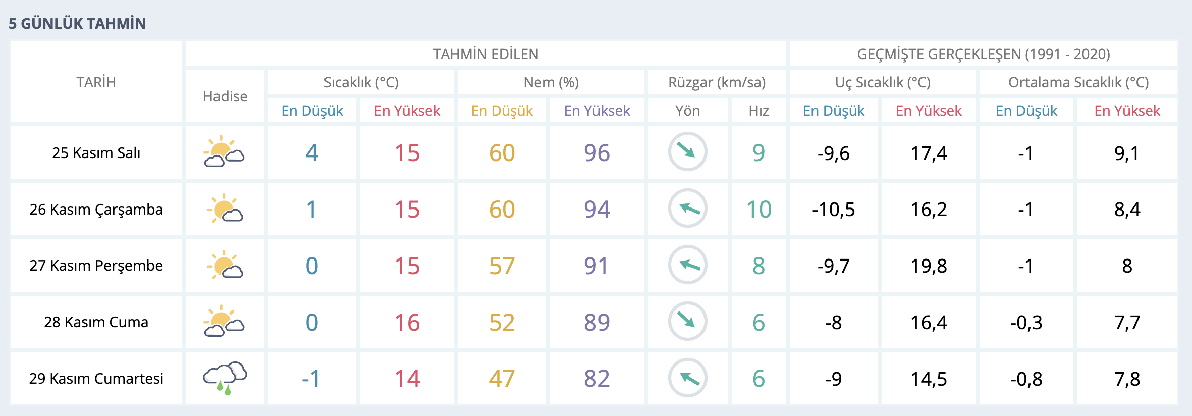 26 Kasım Çarşamba günü sıcaklık daha da düşüyor. En düşük sıcaklık 1°C’ye inerken, gün içinde 15°C’ye kadar yükselmesi bekleniyor. Nem oranı %60 ile %94 arasında seyredecek.