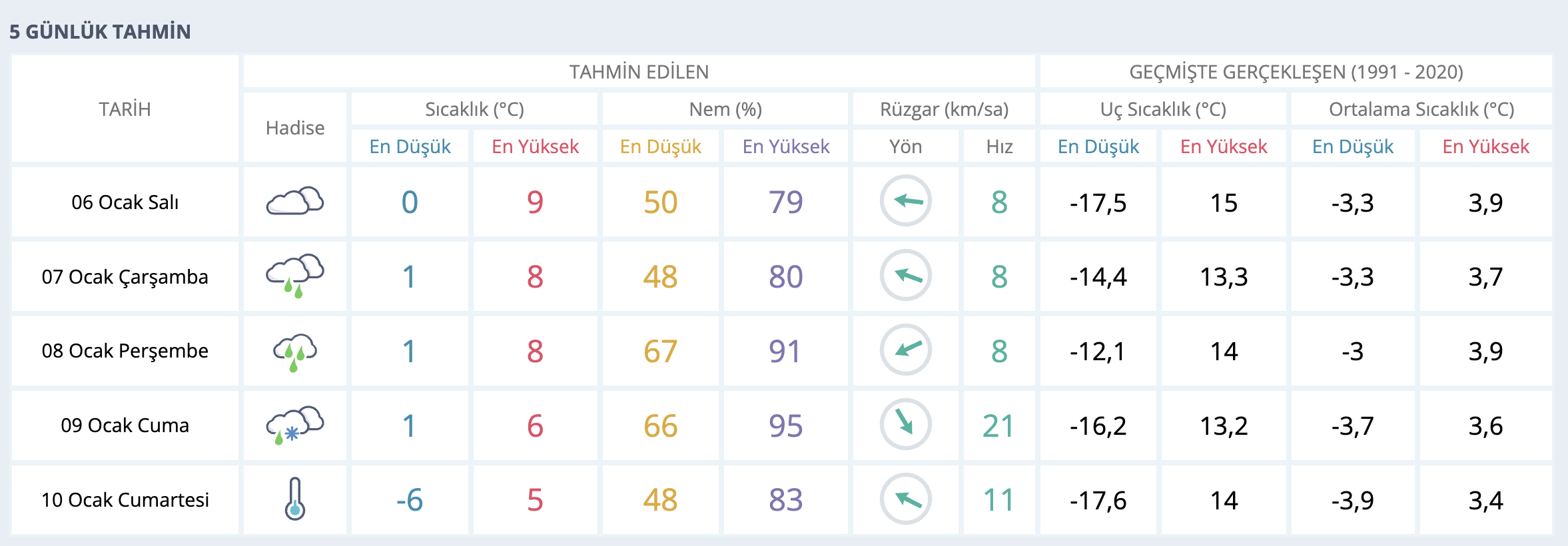 9 Ocak Cuma günü hava şartlarının daha da sertleşmesi bekleniyor. Yağmurla birlikte karla karışık yağmur ihtimali öne çıkarken, rüzgâr hızının saatte 21 kilometreye kadar çıkabileceği belirtiliyor. Gün içerisinde sıcaklıkların 1 ila 6 derece arasında olması bekleniyor.