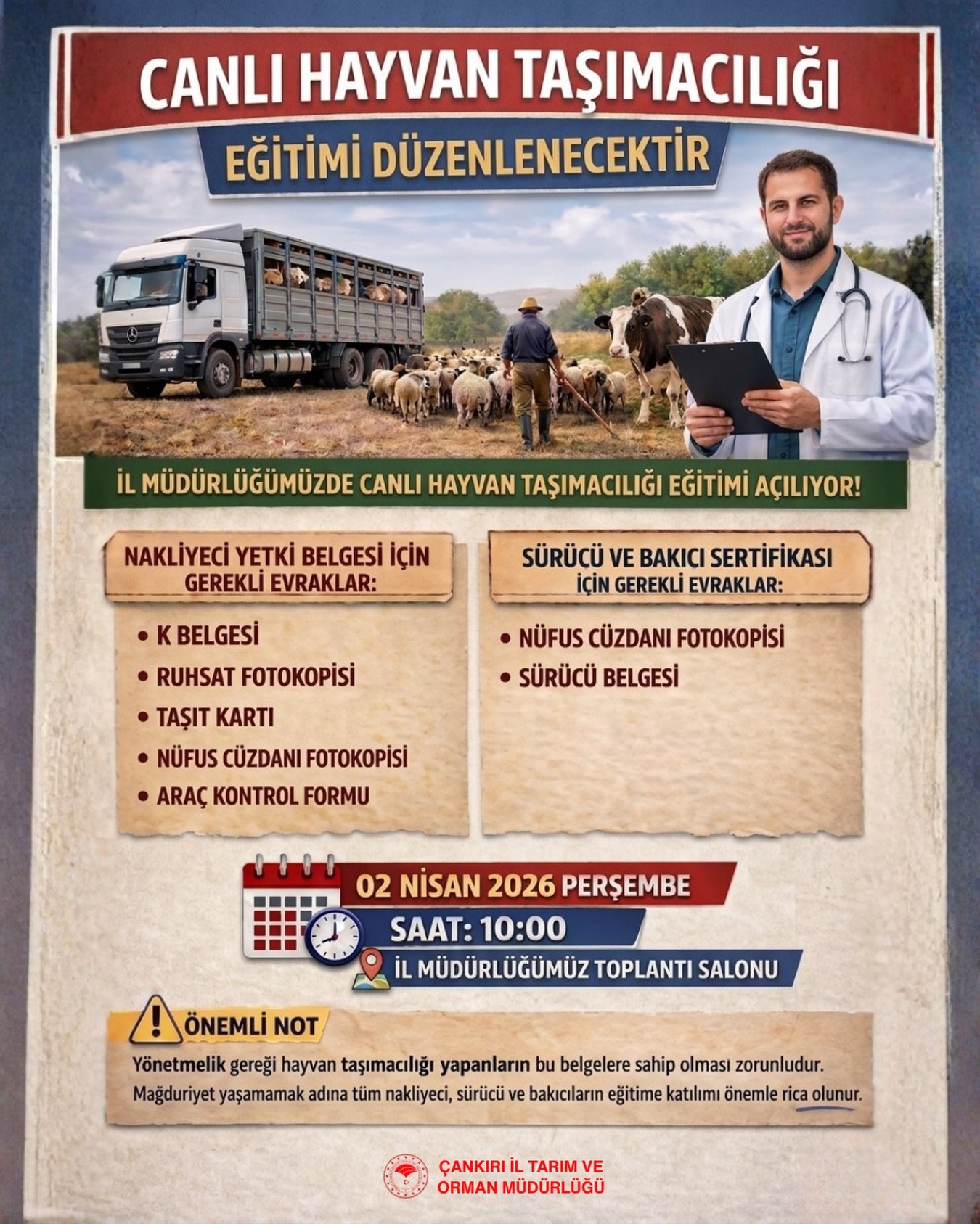 Çankırı İl Tarım ve Orman Müdürlüğü, hayvan taşımacılığı alanında faaliyet gösteren nakliyeci, sürücü ve bakıcılara yönelik eğitim düzenleneceğini duyurdu. Yapılan bilgilendirmeye göre eğitim, “Hayvanların Nakilleri Sırasında Refahı ve Korunması Yönetmeliği” kapsamında gerçekleştirilecek.