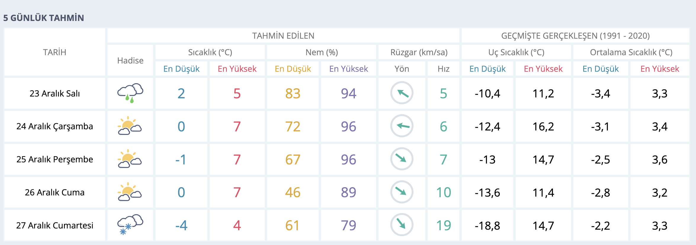 23 Aralık Salı: En düşük 2, en yüksek 5 derece. Yağışlı hava etkili olacak.
