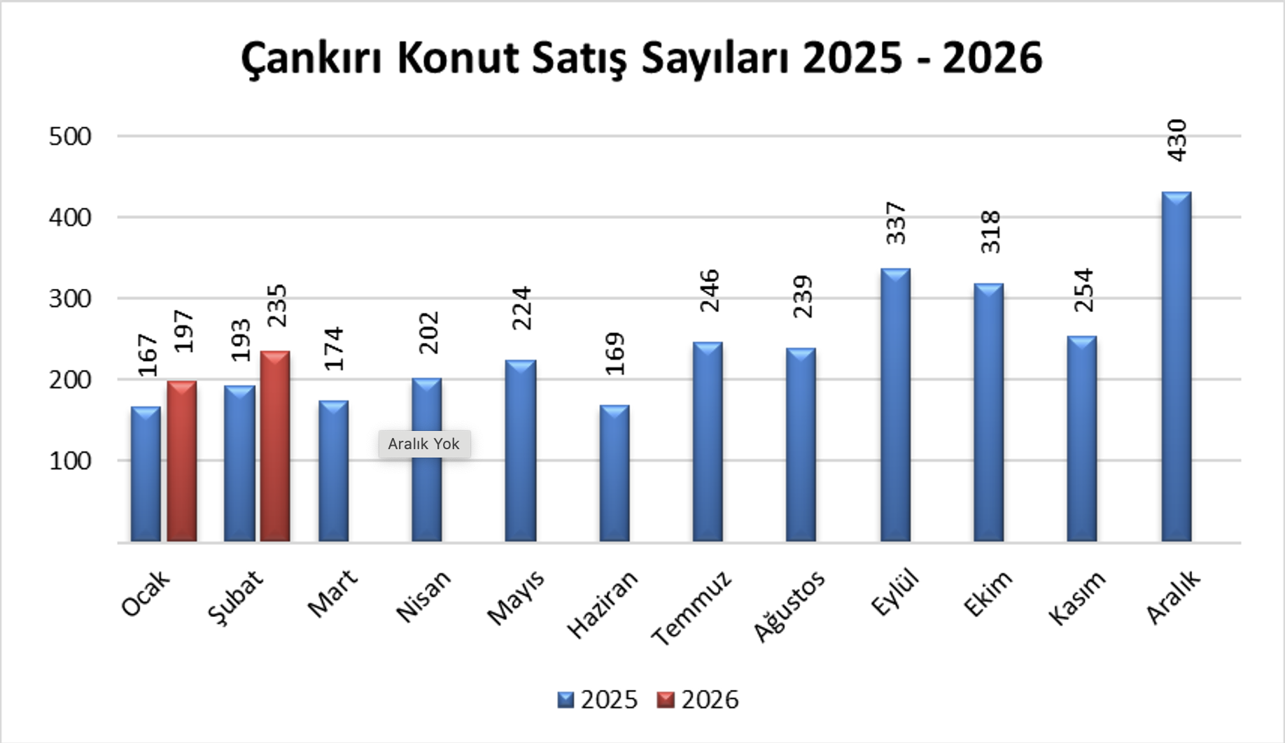 Türkiye İstatistik Kurumu (TÜİK) tarafından açıklanan 2026 yılı Şubat ayı Konut ve İşyeri Satış İstatistikleri verilerine göre Çankırı’da konut satışlarında artış yaşandı. Şubat ayında kent genelinde 235 konut satışı gerçekleşirken, bu sayı geçen yılın aynı ayına göre 42 adet artış gösterdi.
