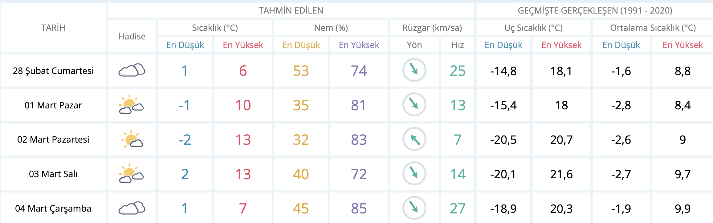 4 Mart Çarşamba günü ise sıcaklıkta düşüş bekleniyor. En düşük sıcaklık 1 derece, en yüksek sıcaklık 7 derece olacak. Nem oranı yüzde 45 ile 85 arasında değişirken, rüzgarın saatte 27 kilometre hızla esmesi bekleniyor.