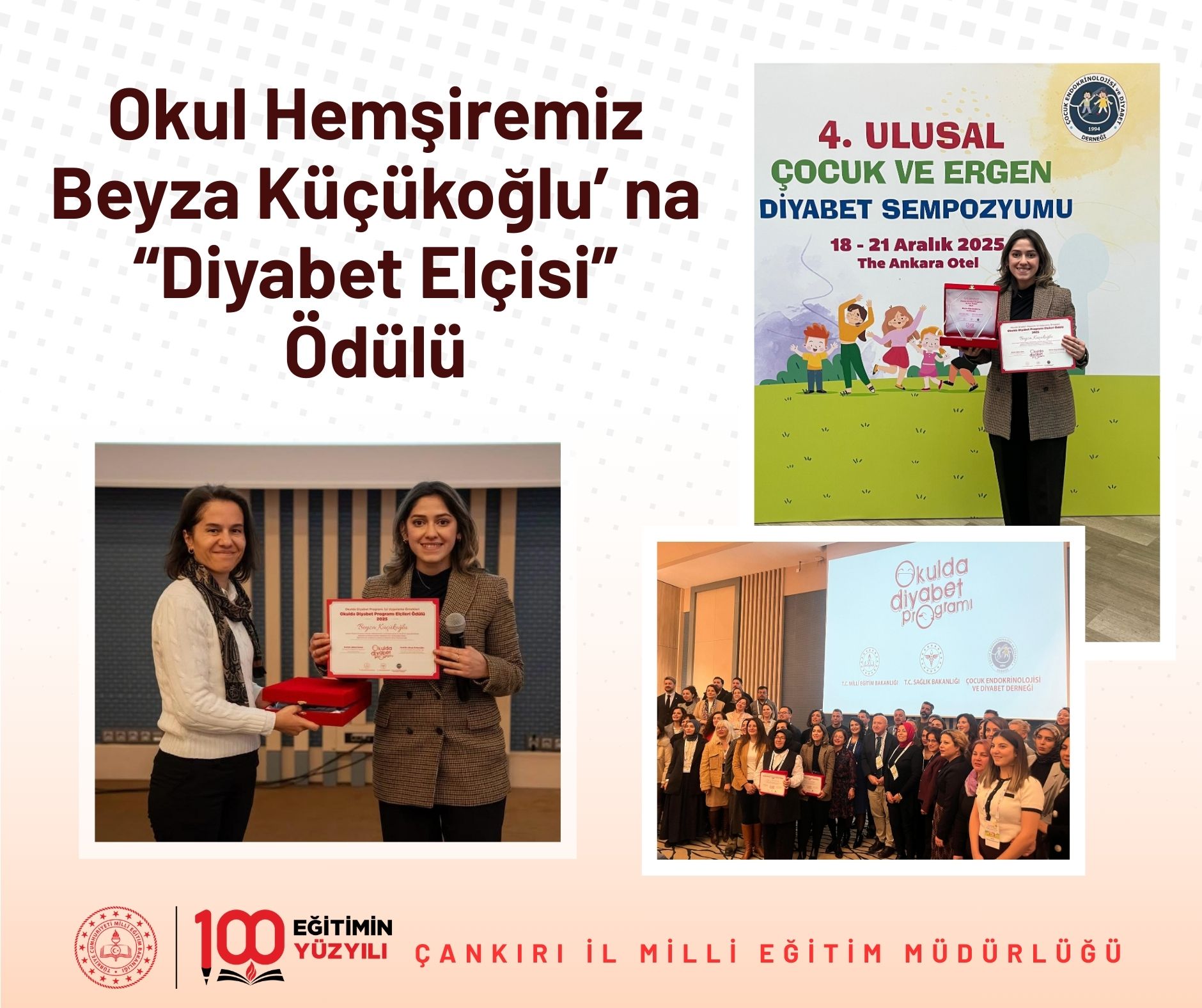Çankırı Şehit Ömer Faruk Biçer Özel Eğitim Meslek Okulu’nda görev yapan okul hemşiresi Beyza Küçükoğlu, Okulda Diyabet Programı kapsamında yürüttüğü örnek ve yenilikçi çalışmasıyla “Diyabet Elçisi” ödülüne layık görüldü. Küçükoğlu’nun başarısı, eğitim ve sağlık alanında Çankırı adına önemli bir gurur kaynağı oldu.