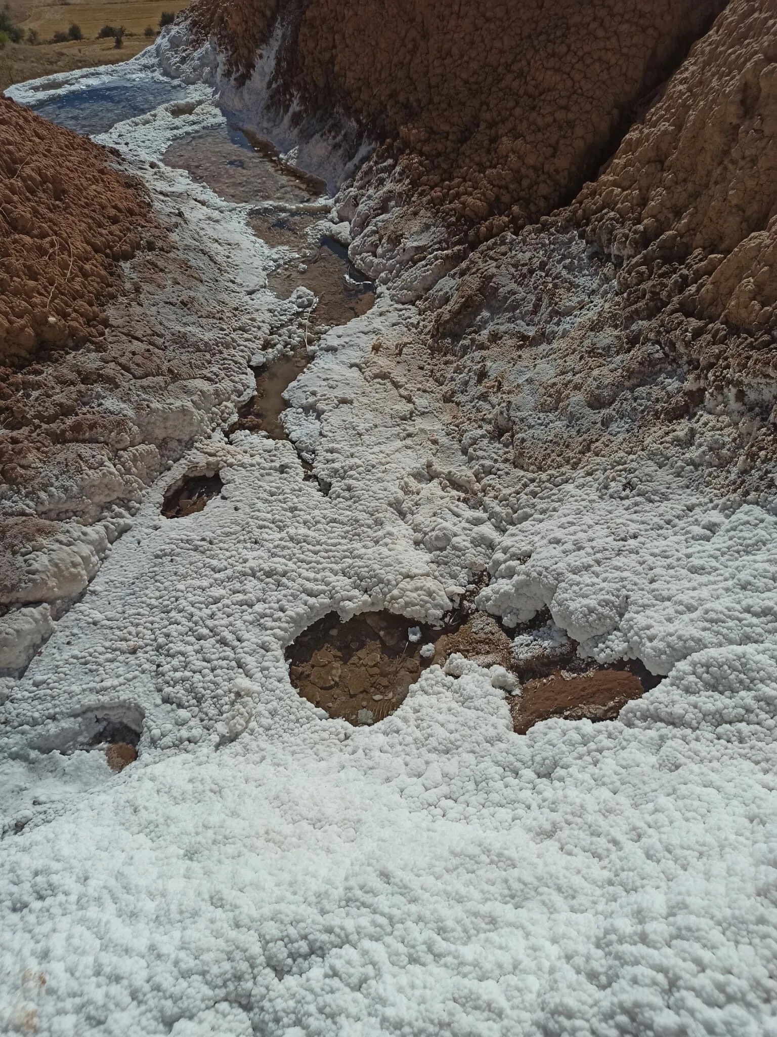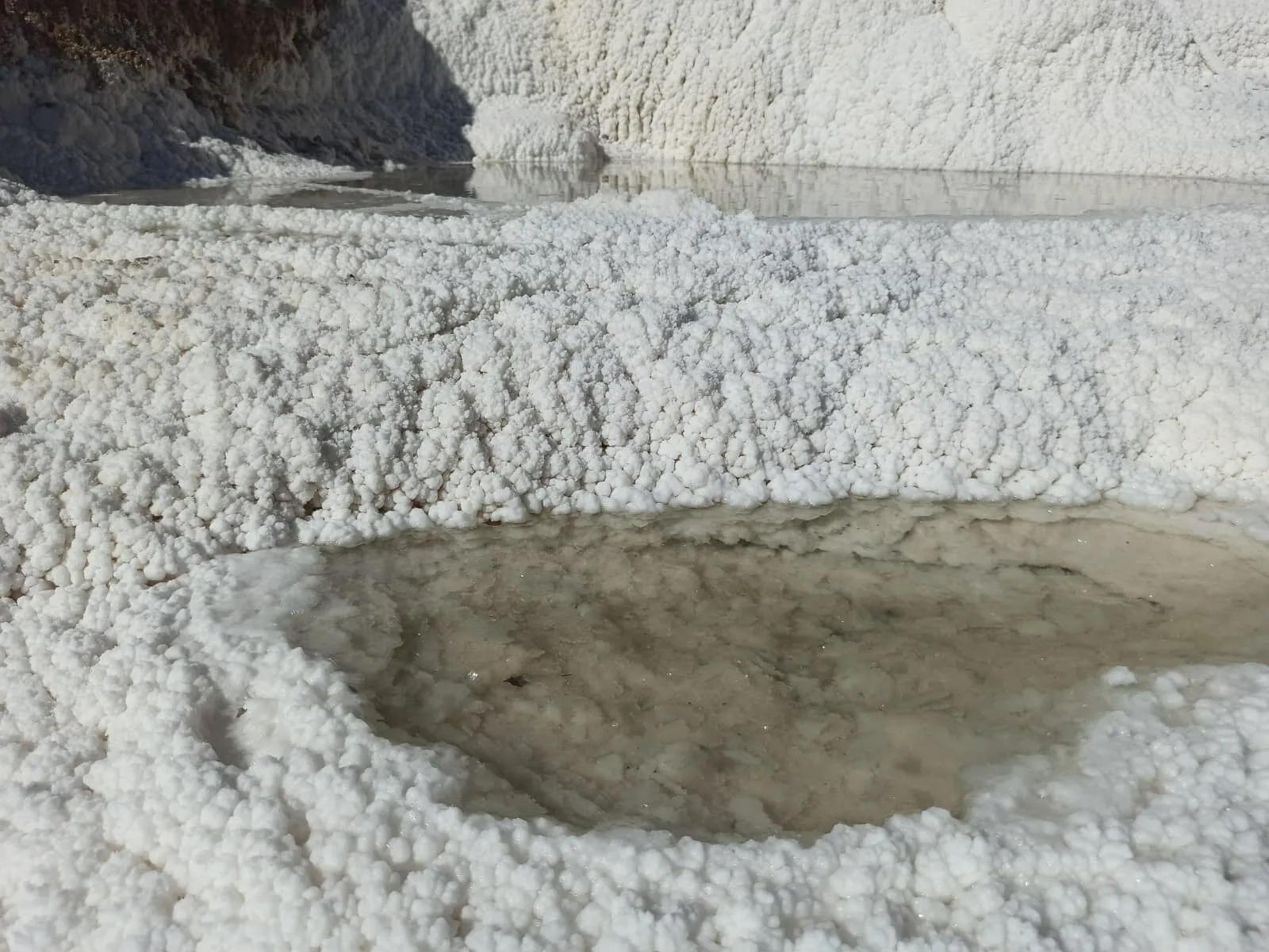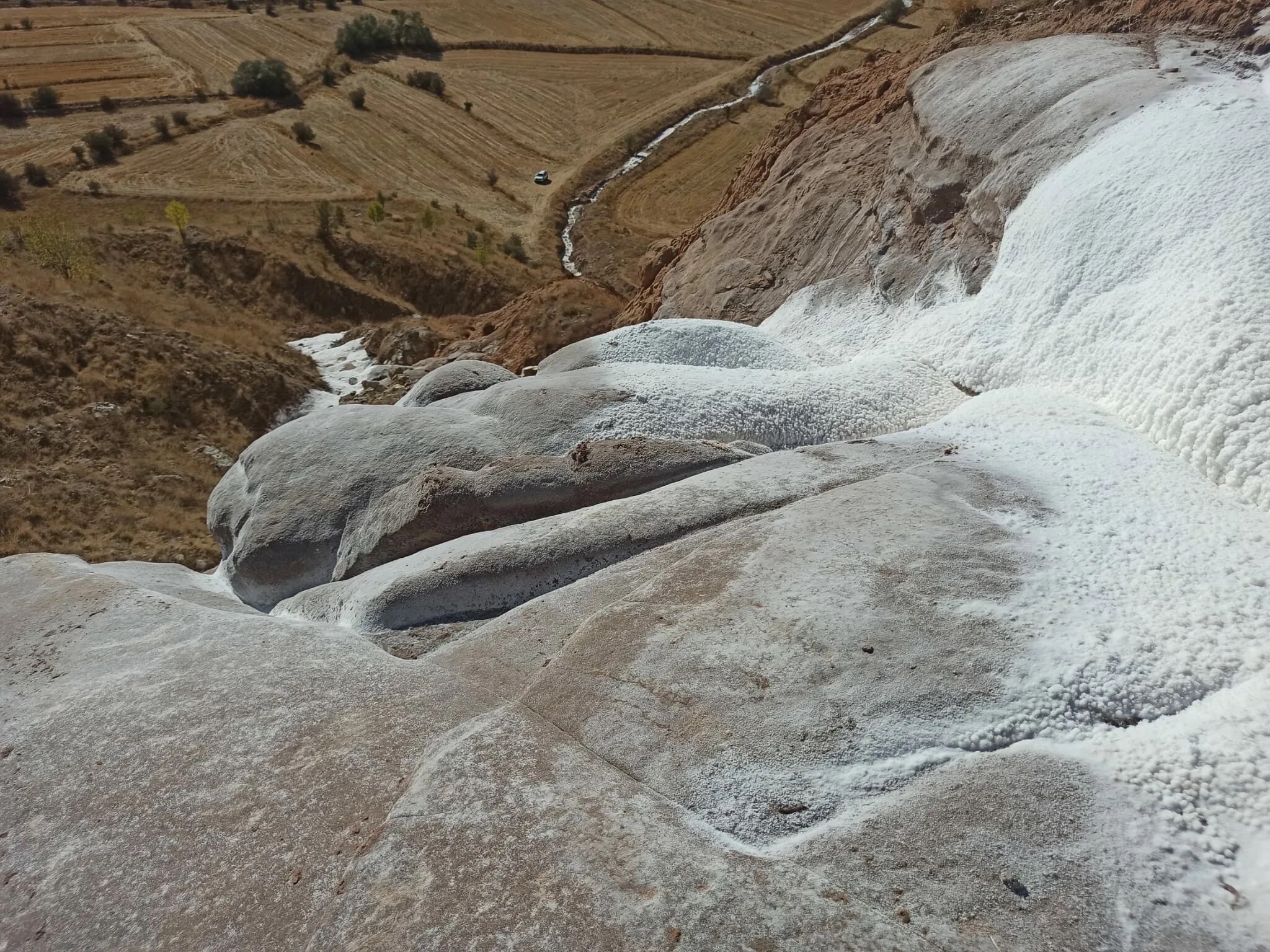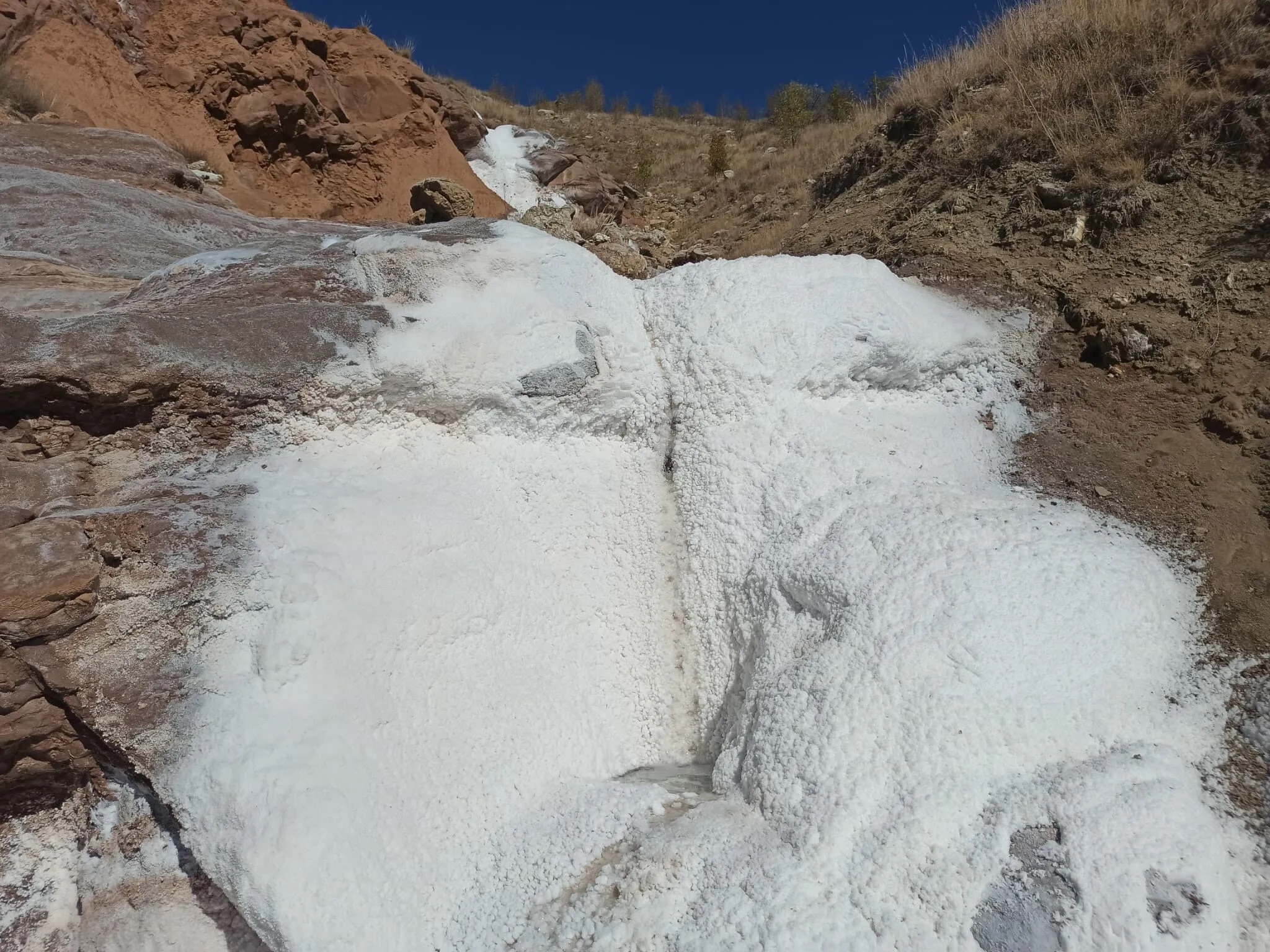 Tepelerden süzülen tuzlu sular, dere yatakları boyunca ilerleyerek zamanla bembeyaz tuz tabakaları oluşturuyor. Güneş ışığıyla birlikte parlayan bu doğal oluşumlar, adeta bir açık hava sanat eserini andırıyor. Kristalleşen tuzlar, dere yatağı boyunca doğal bir heykel gibi şekillenerek kartpostallık görüntüler ortaya çıkarıyor.