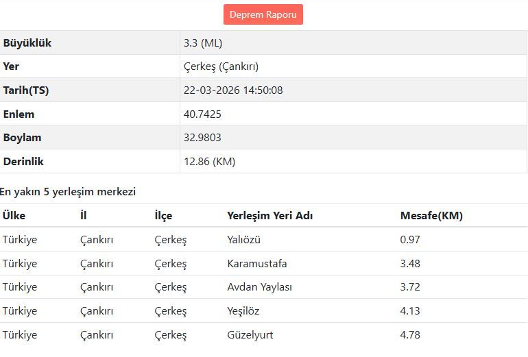 Çankırı’nın Çerkeş ilçesinde 22 Mart 2026 tarihinde meydana gelen iki ayrı deprem, bölgede yaşayan vatandaşlar arasında kısa süreli bir tedirginlik yarattı. Gün içerisinde farklı saatlerde kaydedilen sarsıntıların büyüklükleri ve derinlikleri dikkat çekerken, depremlerin aynı bölgeye yakın noktalarda gerçekleşmesi öne çıktı.