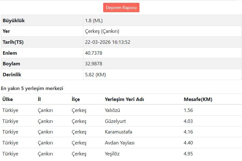 Günün ilerleyen saatlerinde ise ikinci bir deprem daha kaydedildi. Saat 16.13’te meydana gelen bu sarsıntının büyüklüğü 1.8 (ML) olarak ölçüldü. Daha yüzeye yakın bir noktada, yaklaşık 5.82 kilometre derinlikte gerçekleşen deprem, yine Çerkeş merkezli olarak kayıtlara geçti. Bu ikinci sarsıntının da benzer şekilde Yalıözü ve çevresindeki yerleşim alanlarına yakın olduğu görüldü.