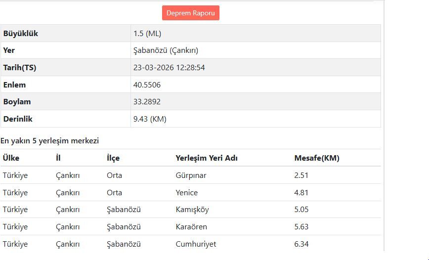 Depremin yerin 9.43 kilometre derinliğinde gerçekleştiği belirlenirken, merkez üssünün Şabanözü olduğu bildirildi. Sarsıntıya ilişkin paylaşılan verilerde, depreme en yakın yerleşim yerleri arasında Gürpınar ve Yenice ile Kamışköy, Karaören ve Cumhuriyet mahallelerinin bulunduğu görüldü.