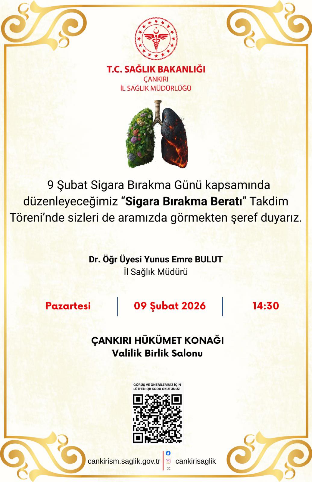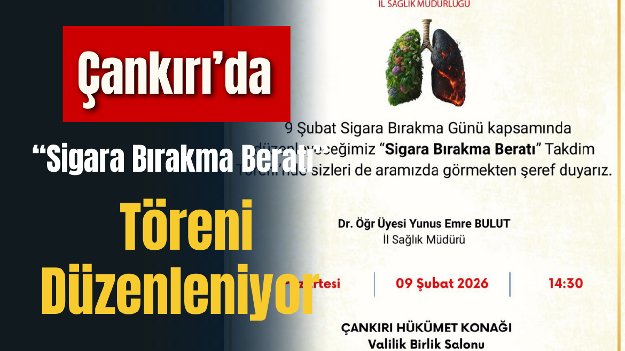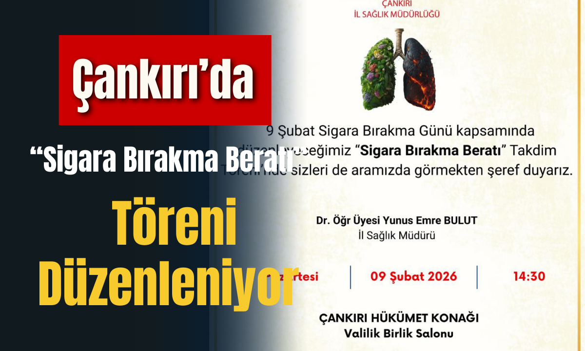 ÖZEL HABER/Çankırı İl Sağlık Müdürlüğü, 9 Şubat Sigara Bırakma Günü kapsamında farkındalık oluşturmak amacıyla “Sigara Bırakma Beratı” takdim töreni düzenleyecek. Sağlıklı yaşam bilincini artırmayı hedefleyen programın, 09 Şubat 2026 Pazartesi günü saat 14.30’da Çankırı Hükümet Konağı Valilik Birlik Salonu’nda gerçekleştirileceği duyuruldu.