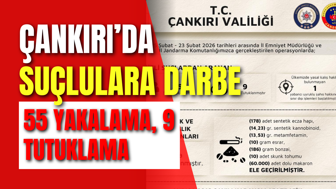 Çankırı Valiliği tarafından yapılan açıklamaya göre, 15 Şubat ile 23 Şubat 2026 tarihleri arasında İl Emniyet Müdürlüğü ve İl Jandarma Komutanlığı ekiplerince il genelinde geniş kapsamlı operasyonlar gerçekleştirildi. Asayiş, narkotik ve kaçakçılıkla mücadele kapsamında yürütülen çalışmalarda önemli sonuçlar elde edildi.